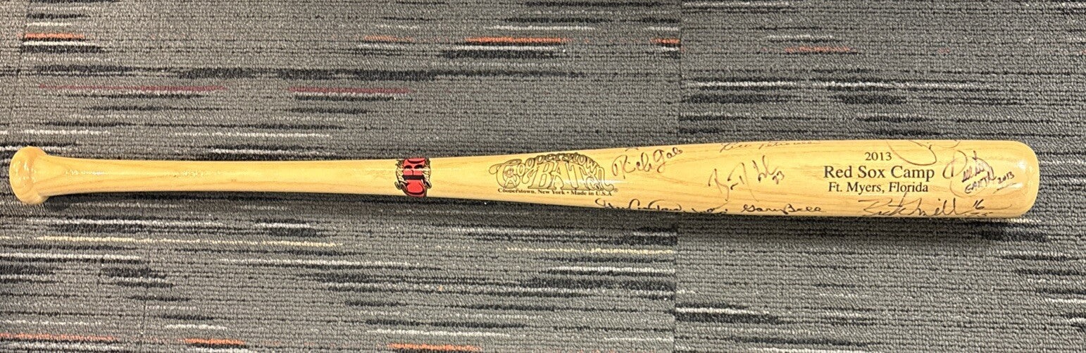 This officially licensed Boston Red Sox baseball bat from the 2013 Red Sox Fantasy Camp is signed by 12 notable players such as Steve Lyons, Bill Lee, Rico Petrocelli, Bill Campbell, and Gary Bell. As a Major League Baseball (MLB) product, this bat holds special significance for fans of the Boston Red Sox and collectors of baseball memorabilia. The signatures on the bat add a unique touch, making it a valuable and sought-after piece for those who attended the fantasy camp or are fans of the team. The signatures are guaranteed by Sportsworld and the bat comes with a certificate of authenticity.