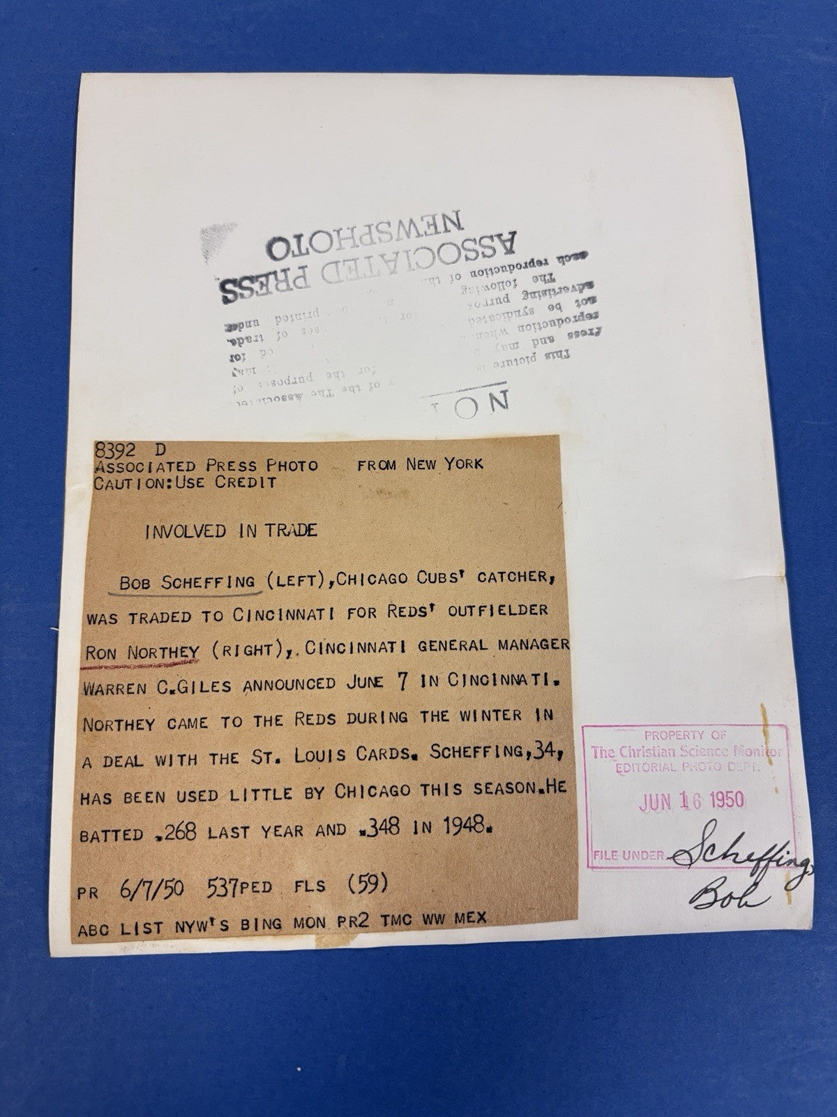 1950 Bob Scheffing Ron Northey Original 7x9 Newspaper Wire Photo Cubs Reds