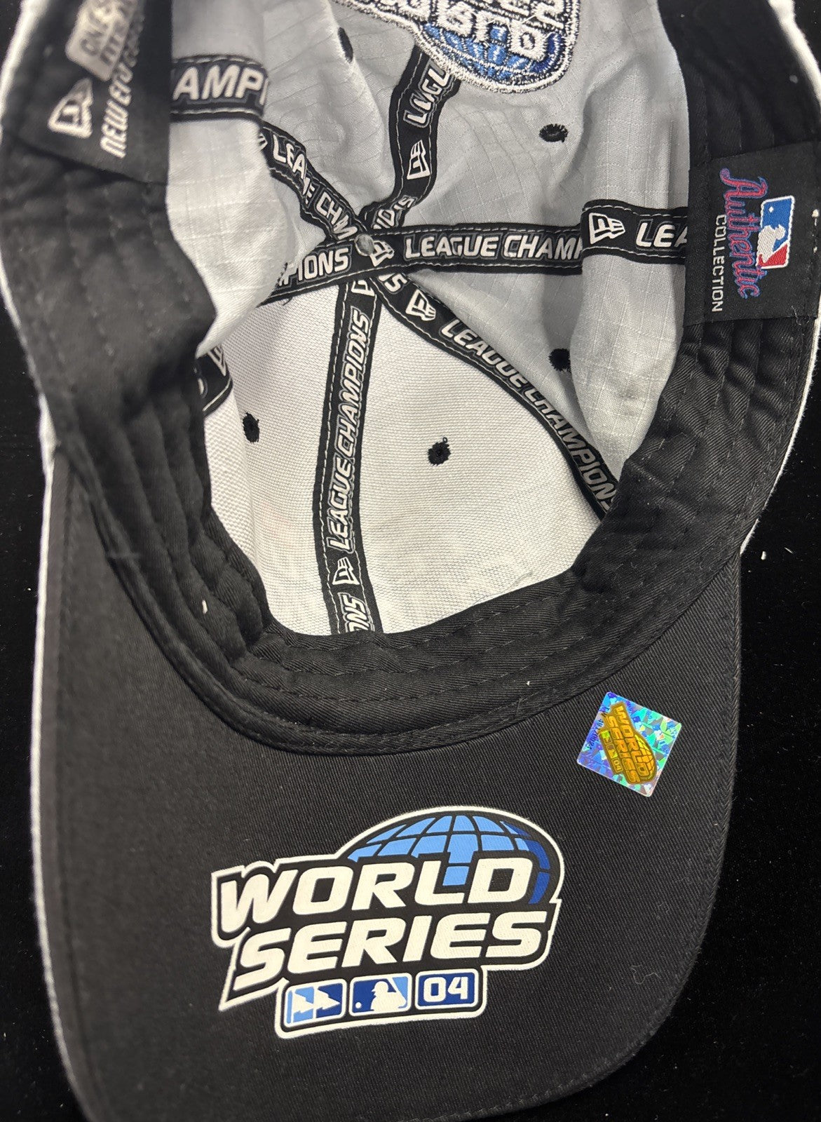 The product is a 2004 Boston Red Sox New Era hat in grey, celebrating the team's League Champions win in Major League Baseball (MLB). This one-size fits all cap is perfect for male fans of the Boston Red Sox, specifically those who attended the World Series. Made by trusted brand New Era, this hat showcases team pride and allegiance for baseball enthusiasts.