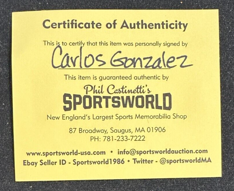 We're offering this Official Major League Baseball Autographed by former Colorado Rockies Star Carlos Gonzalez. It's in ex condition and with a COA Issued by Sportsworld, New England's Largest Sports Memorabilia Store and his signature is guaranteed to be 100% authentic. The ball will be shipped in a plastic display cube.
