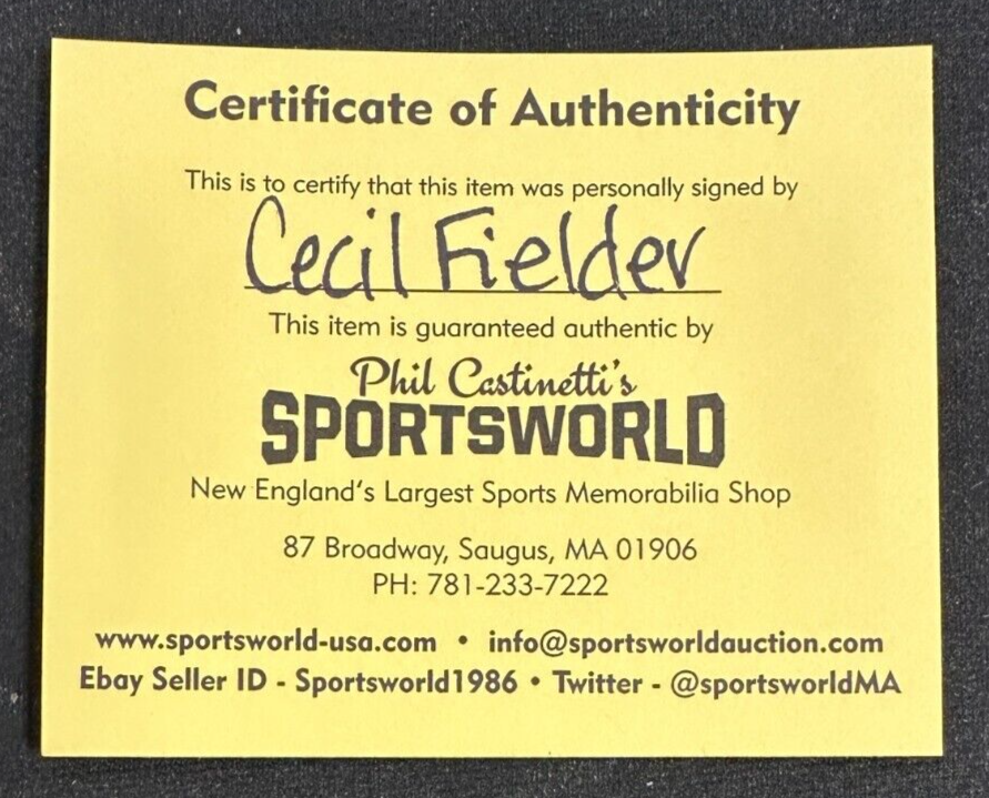 We're offering this Official American League Baseball Autographed by former Detroit Tigers Slugger Cecil Fielder. It's in ex condition and with a COA & Hologram Issued by Sportsworld New England's Largest Sports Memorabilia Store and his signature is guaranteed to be 100% authentic. The ball will be shipped in a plastic display cube and, we will combine on shipping for similar items.