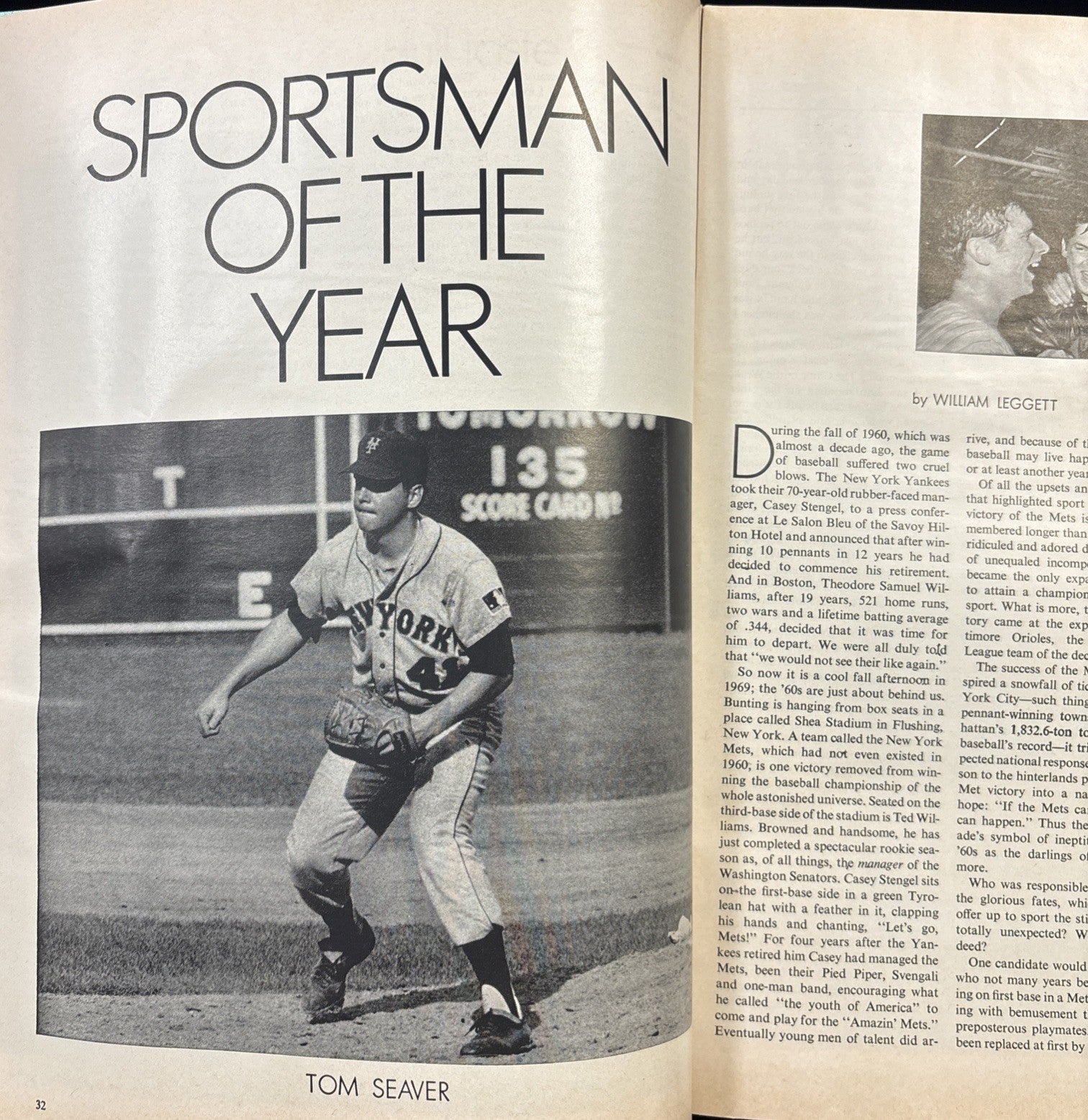 The product is a vintage Sports Illustrated magazine from December 22, 1969 featuring Tom Seaver of the New York Mets. It is a rare collectible item for fans of baseball memorabilia, specifically highlighting the Sportsman of the Year award for Tom Seaver in 1969. The magazine captures a significant moment in baseball history and celebrates the talents of a legendary player from the New York Mets. ** A mailing label is affixed to cover**
