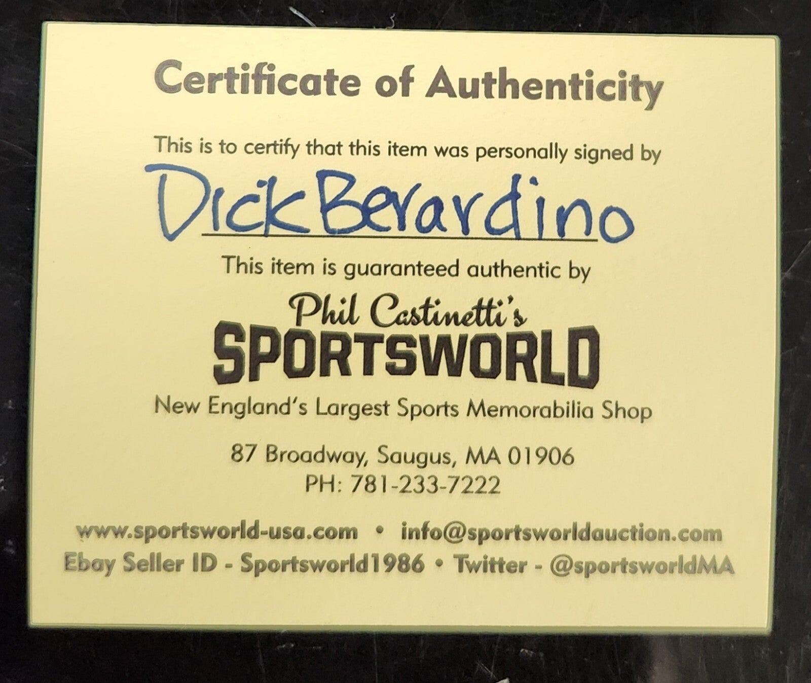 The COA is from Sportsworld- New England's largest sports memorabilia shop. Please refer to our pictures to be sure.