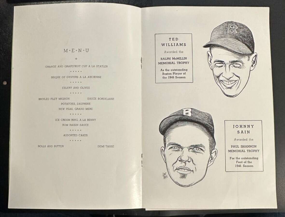 This is extremely rare program from the Eighth Annual Boston Baseball Writers Association of America on February 4, 1947, at the Hotel Statler in Boston. Inside it lists the nights honorees and well as the menu for the evening. The Program came from the personal collection of a longtime Boston Sportswriter and is in excellent condition.
