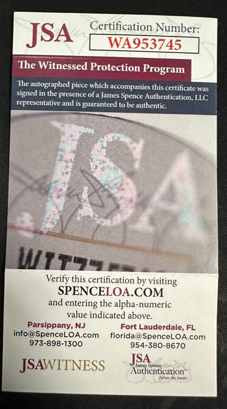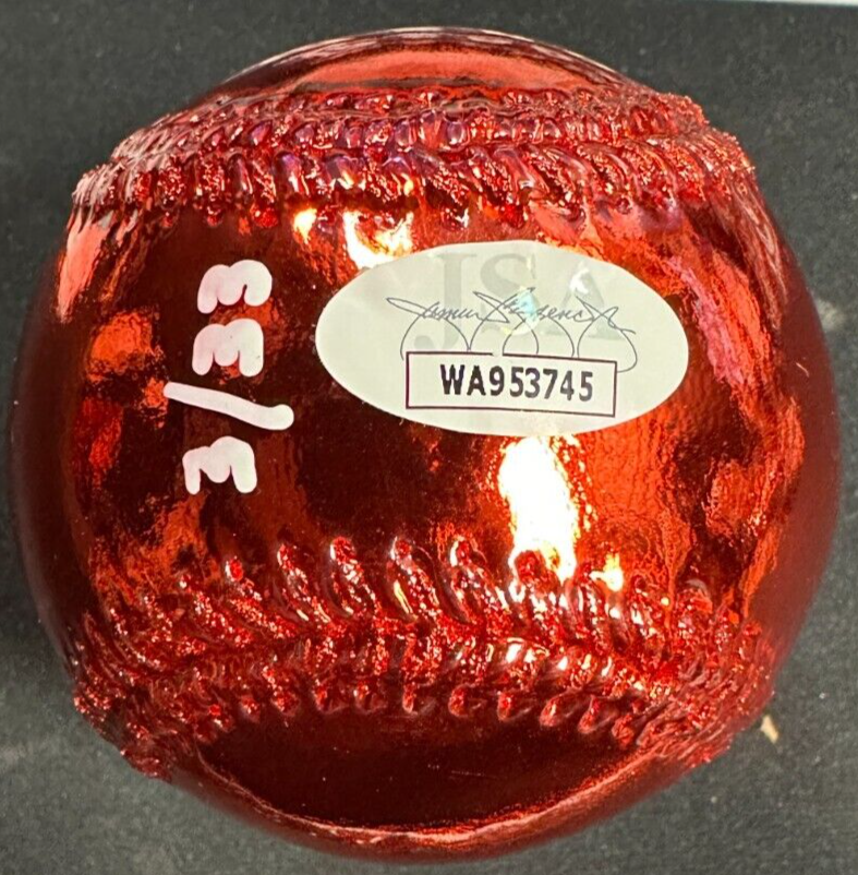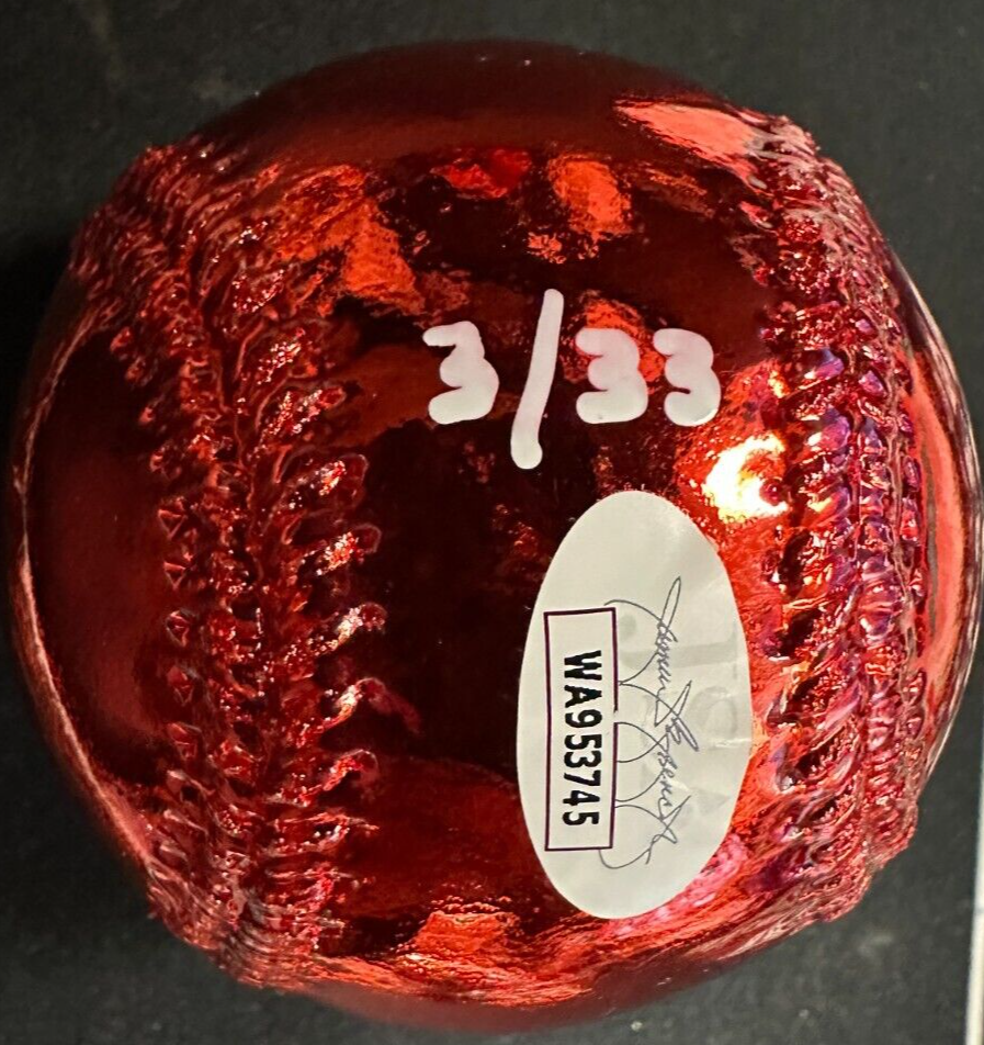 We're offering this Red Chrome Baseball Autographed by All-Star Catcher Jason Varitek of the Boston Red Sox. It's in perfect condition, it's hand numbered 3/33 and comes with a COA & Matching Hologram Issued by JSA (WA953745) James Spence Authentication and his signature is guaranteed to be 100% authentic. The ball will be shipped in a plastic display cube, and we will combine on shipping for similar items!