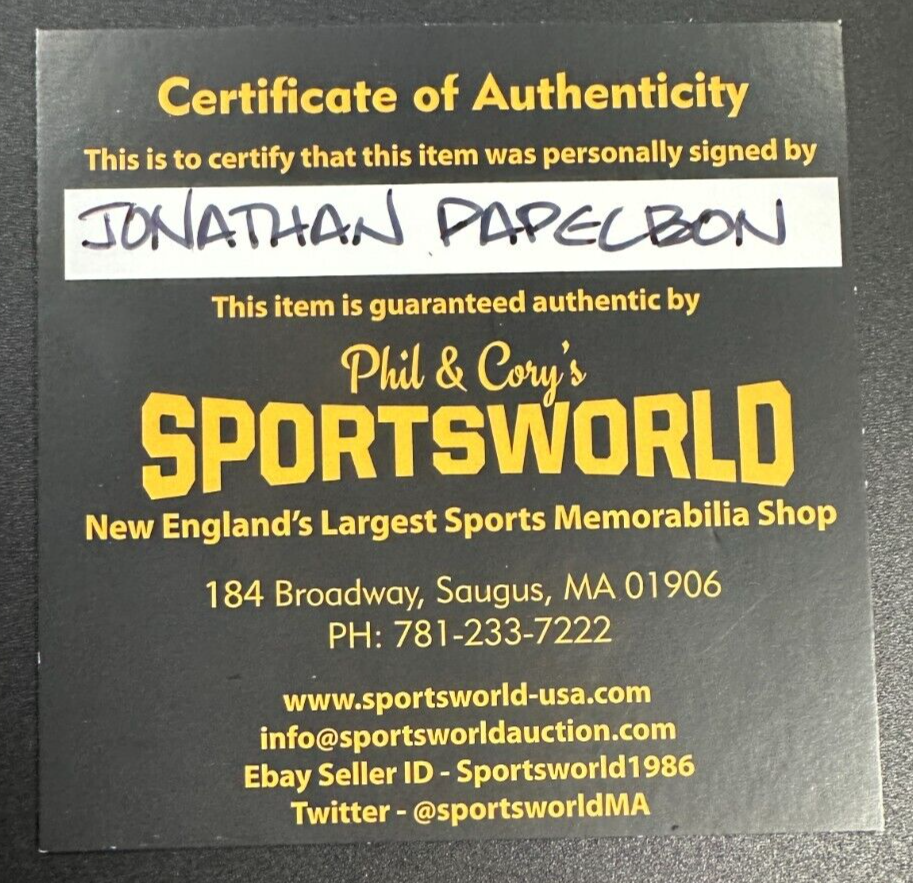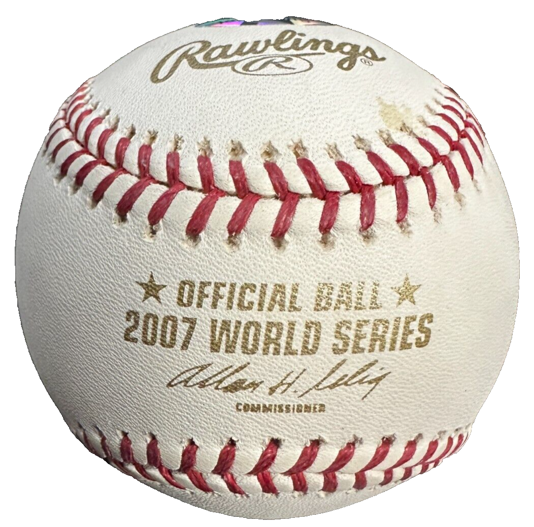We're offering this Rawlings Official 2007 World Series Logo Baseball Autographed by closer Jonathan Papelbon of the Boston Red Sox. The ball is in excellent, it comes with a Hologram issued by Sure Shot Promotions (10739) as well as a COA from Sportsworld, New England's Largest Sports Memorabilia Store and his signature is guaranteed to be 100% authentic. It will be shipped on a plastic display square, and we will combine on shipping for similar items!