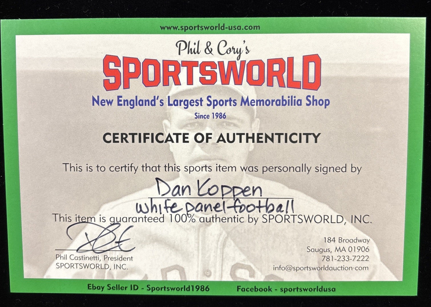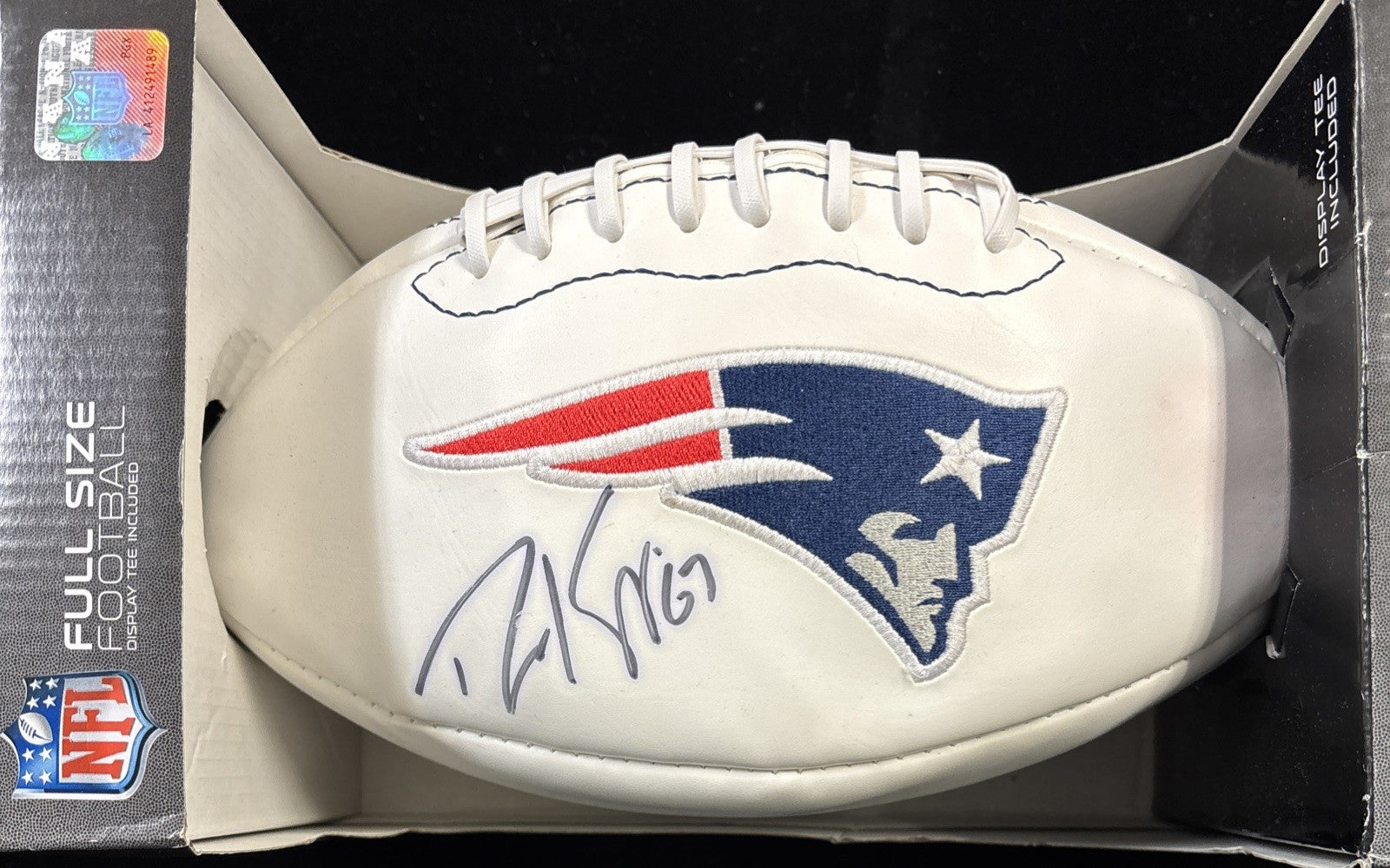 The product is an officially licensed full size football featuring the signature of former New England Patriots player Dan Koppen. This collectible item is perfect for fans of the NFL and specifically the New England Patriots. The white color scheme adds a stylish touch to this unique piece of fan apparel and souvenir. With a Certificate of Authenticity (COA) included, this autographed football is a must-have for any devoted football enthusiast looking to own a piece of sports history.