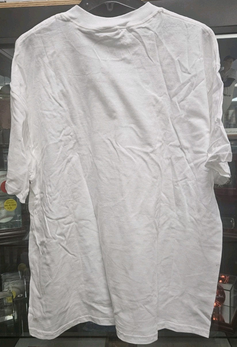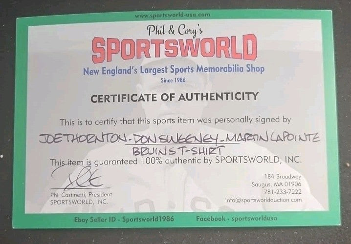 The product is an autographed charity dinner t-shirt featuring signatures from Joe Thornton of the Boston Bruins. The shirt is a collectible item from the charity event and includes authentication from Sportsworld, ensuring the legitimacy of the signatures. As a piece of memorabilia, this item is a unique and valuable piece for fans of the Boston Bruins and hockey enthusiasts alike. It is an original product, not a reprint, adding to its desirability among collectors of autographed NHL items.