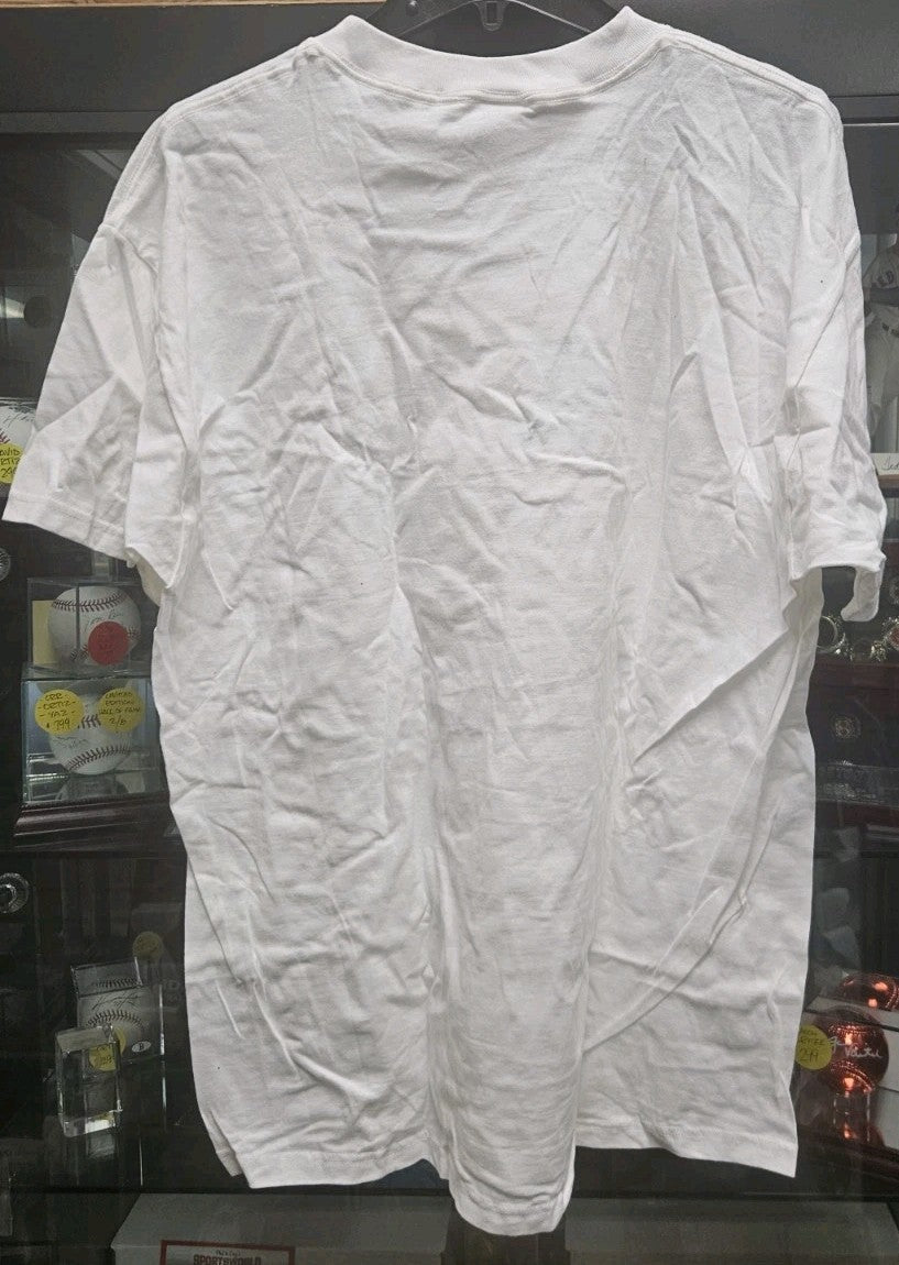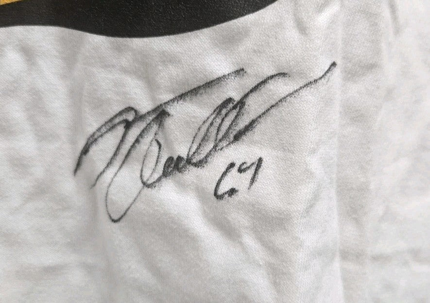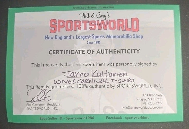 The product is an autographed Boston Bruins wives carnival t-shirt featuring the signature of hockey player Jarno Kultanen. The autograph is authenticated by Sportsworld and considered original. This unique item would be a prized possession for any fan of the Boston Bruins or hockey enthusiasts.