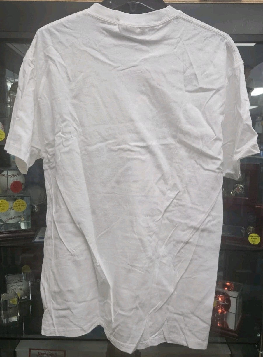 The product is an autographed T-shirt by hockey player Sergei Samsonov, featuring his signature as well as the logo of the Boston Bruins. This item has been authenticated by Sportsworld, making it a valuable collectible for fans of the NHL team. With the autograph being original, this shirt would be a prized possession for any enthusiast of hockey memorabilia.