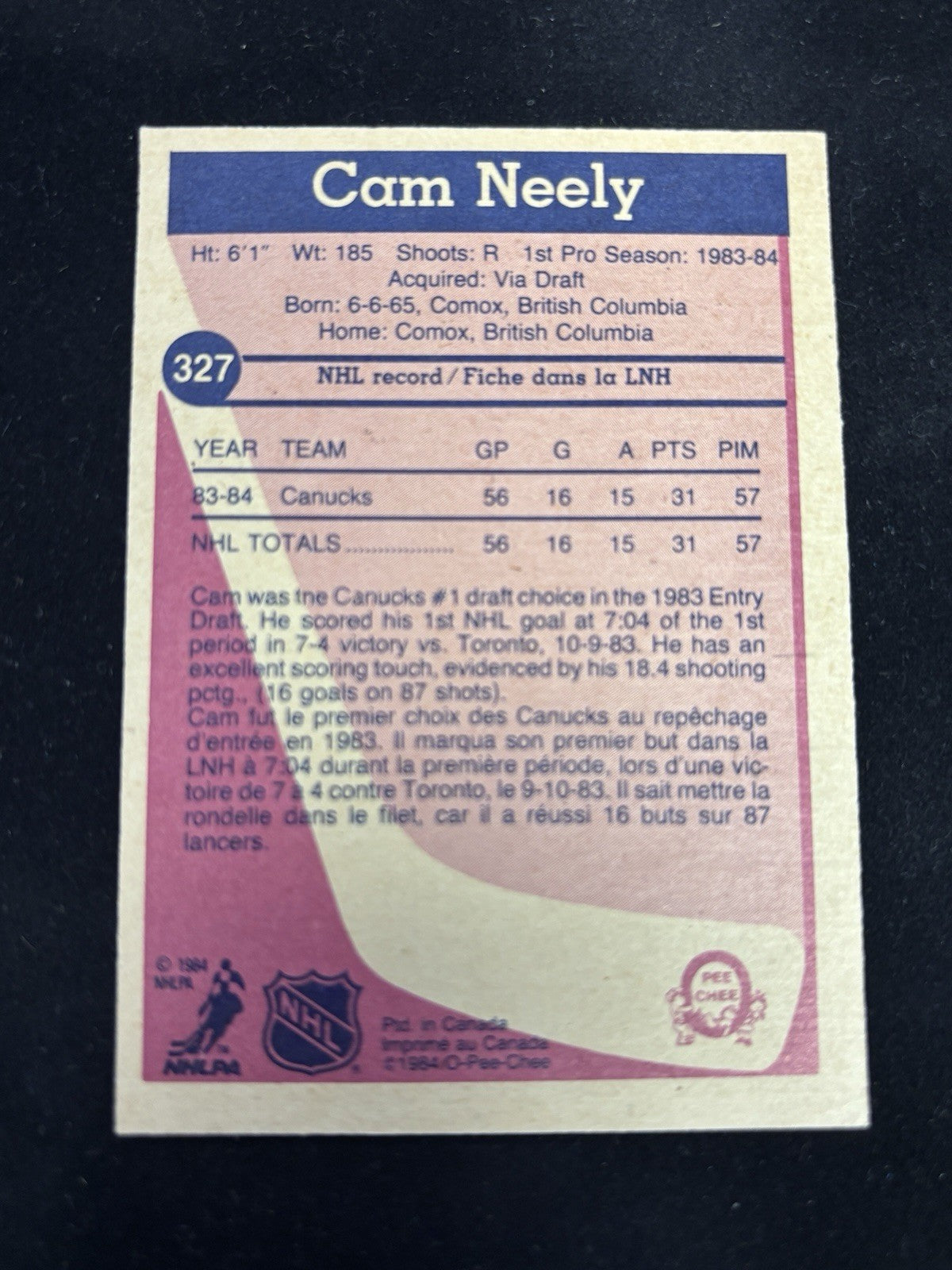 We're offering this 1984-85 O-Pee-Chee Cam Neely Autographed Rookie Card. It's card #327 in the set and was signed by Cam in person and we will combine on shipping for multiple purchases.