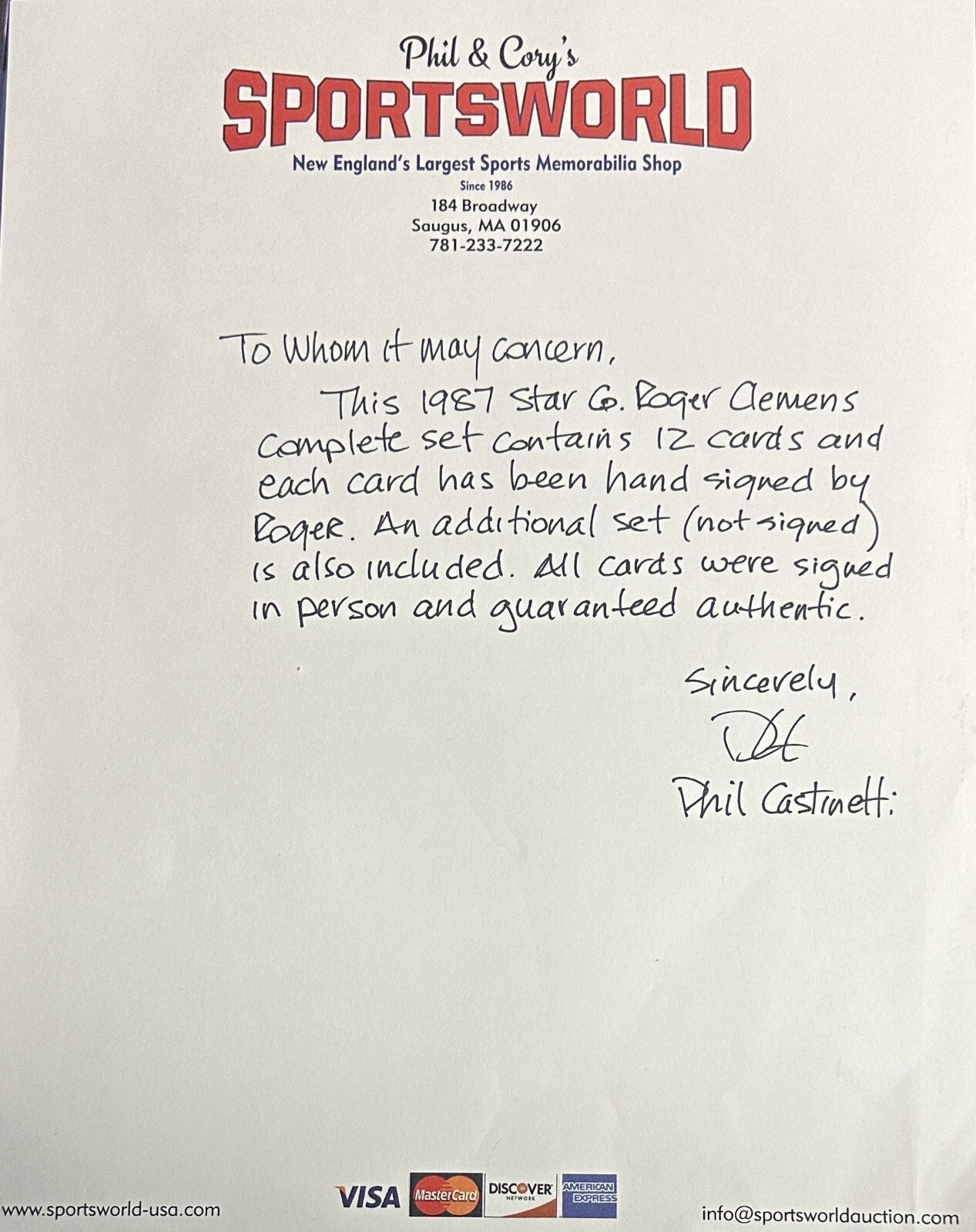 We're offering this 1987 Star Co. Roger Clemens Set. There are 12 cards in the in the set and they have all been autographed by Roger in person. The cards are in ex/mt-nm condition and come with a COA issued by Sportsworld, New England's Largest Sports Memorabilia Store and are guaranteed to be 100% authentic. We will also include a second unsigned set in similar condition.