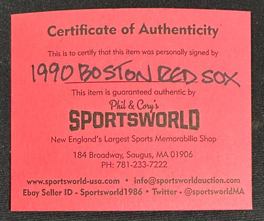 We're offering this Official Bobby Brown American League Baseball Autographed by the 1990 Boston Red Sox Team. Signatures on the ball include Roger Clemens, Rac Slider, Ellis Burks, Tim Naehring, Joe Hesketh, John Marzano, Jeff Gray, Kevin Romine, Dick Beradino, Danny Heep, Joe Morgan, Mike Boddicker, Larry Anderson, Dennis Lamp, Tom Bolton, Marty Barrett, Jeff Reardon, Tom Brunansky, Jody Reed, Al Bumbry, Dana Kieker, Randy Kutcher, Mike Greenwell, Rob Murphy, Bill Fischer & Wade Boggs among others. It comes with a COA issued by Sportsworld, New England's Largest Sports Memorabilia Shop and the signatures are guaranteed to be 100% authentic. We will combine on shipping for similar items!