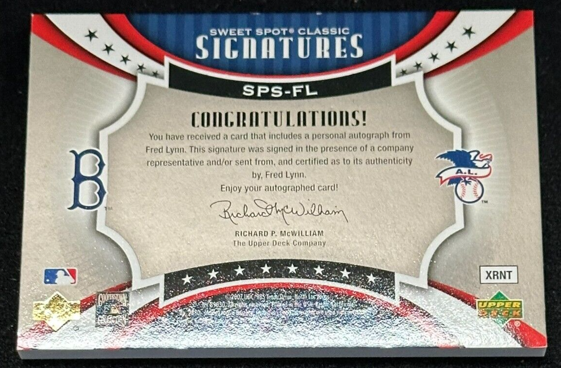 We're offering this 2007 Upper Deck Sweet Spot Classic Signatures Fred Lynn Autographed Glove Card. It's numbered 29/50, is card #SPS-FL in the set and is in nm-mt condition.