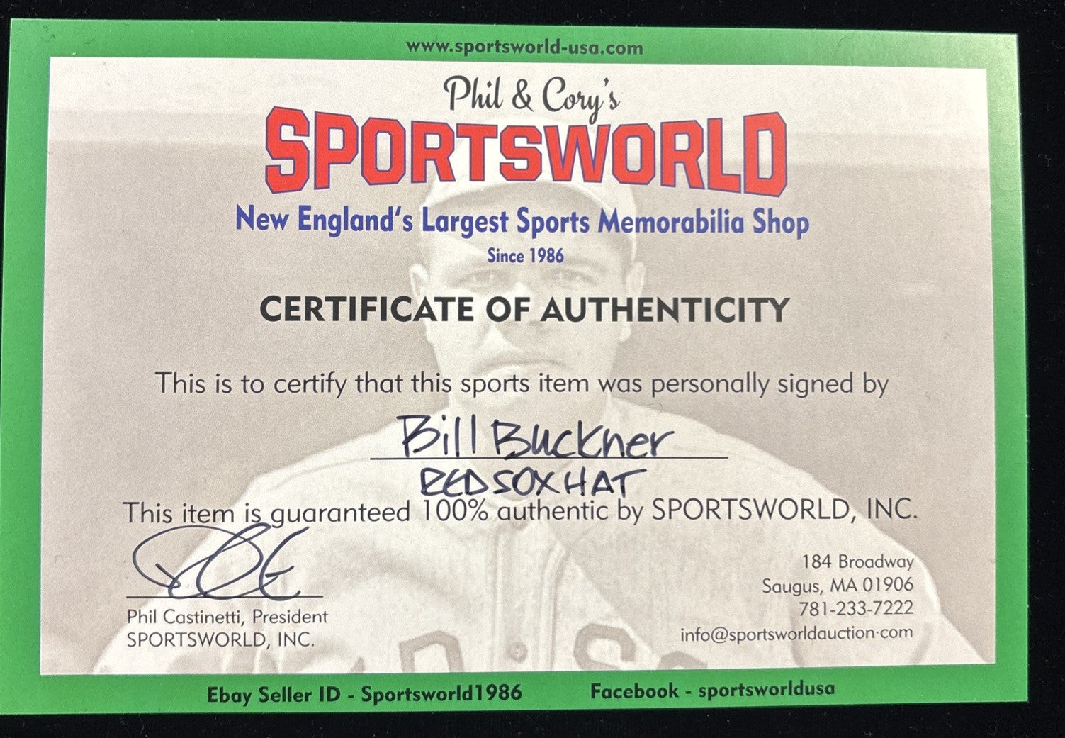 We're offering this Boston Red Sox Fitted Hat Autographed by All-Star 1st Baseman Bill Buckner. The hat is a size 7 and is made by New Era, and it comes with a COA issued by Sportsworld, New England's Largest Sports Memorabilia Store as well a hologram issued by Fleer Authentic and his signature is 100% authentic.
