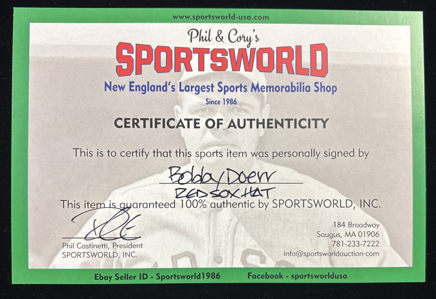 We're offering this Boston Red Sox Fitted Hat Autographed by Hall of Fame Infielder Bobby Doerr. The hat is a size 6 7/8 and is made by New Era, and it comes with a COA issued by Sportsworld, New England's Largest Sports Memorabilia Store and his signature is 100% authentic.