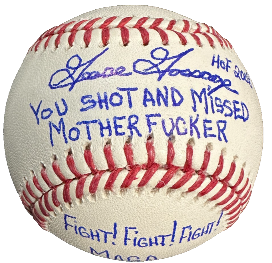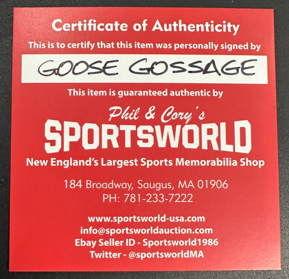 We're offering this Official Rawlings Major League Baseball Autographed & Inscribed with "HOF 2008 & Fight Fight Fight MAGA & More" by New York Yankees Closer Goose Gossage. It's in nm condition; it comes with a COA issued by Sportsworld; New England's Largest Sports Memorabilia Store and his signature is guaranteed to be 100% authentic. The ball will be shipped in a plastic display cube, and we will combine on shipping for similar items!