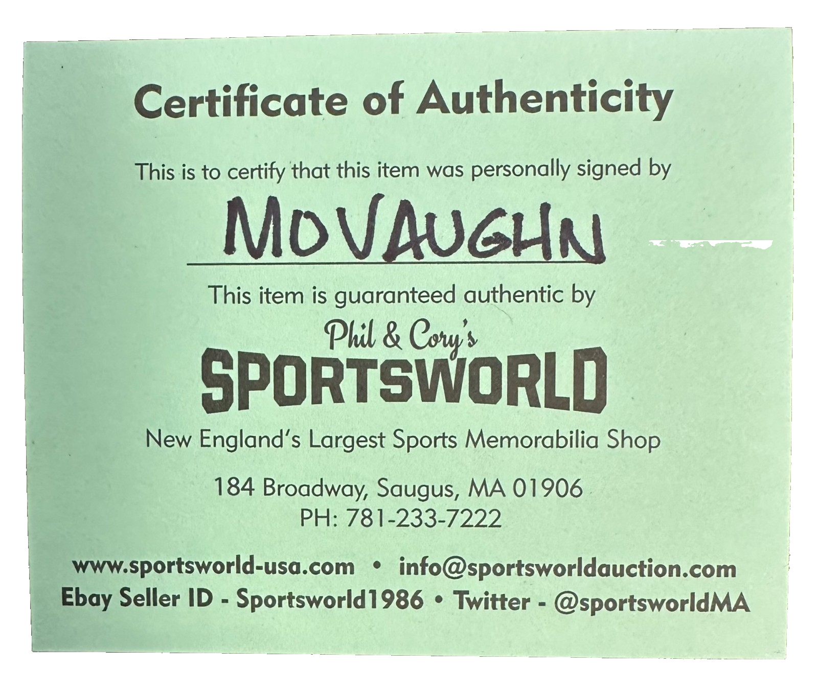 We're offering this Official MLB Game Baseball Autographed & Inscribed with "95 AL MVP" by Mo Vaughn of the Boston Red Sox. It's in ex condition and with a COA Issued by Sportsworld, New England's Largest Sports Memorabilia Store and his signature is guaranteed to be 100% authentic. The ball will be shipped in a plastic display cube, and we will combine shipping on similar items.