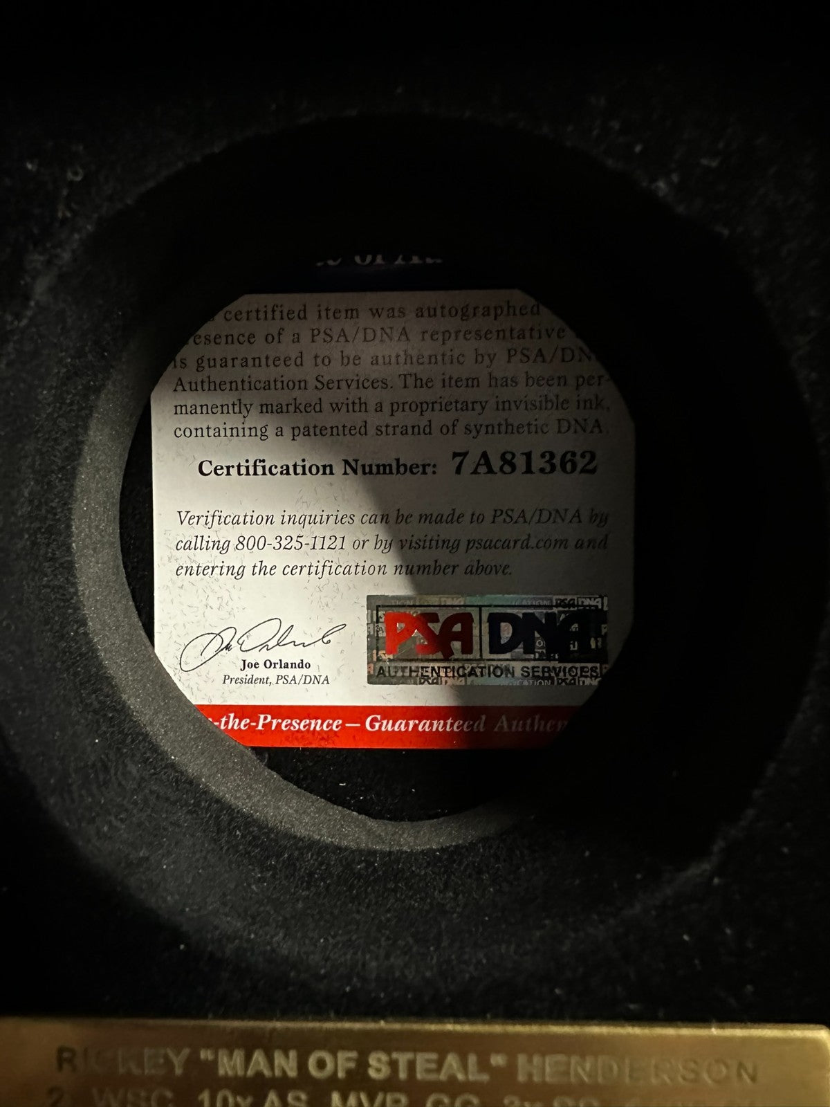 We're offering this Official Rawlings Major League Baseball Autographed by Hall of Fame Outfielder Rickey Henderson of the Oakland A's. It's in excellent condition it comes with a COA & Matching hologram from PSA/DNA (7A81632) and his signature is guaranteed to be 100% authentic. The ball comes with a Custom Wooden Display, with a glass door and custom brass nameplate. We will combine on shipping for similar items!