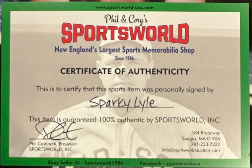 We're offering this 8x10 Photo Autographed & Inscribed with "67 WS" by Pitcher Sparky Lyle of the Boston Red Sox. It comes with a COA Issued by Sportsworld New England's largest sports memorabilia store, and his signature is guaranteed to be 100% authentic. We will combine on shipping for similar items!