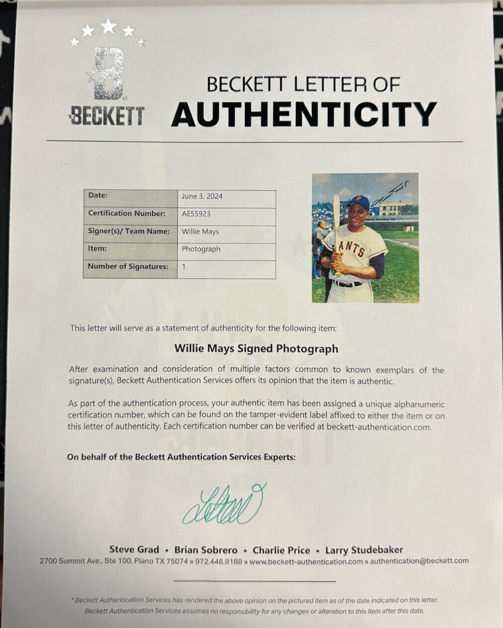 We're offering this 8x10 Photo Autographed by Hall of Fame Outfielder Willie Mays of the San Francisco Giants. It comes with a Full Letter LOA & Matching Hologram issued by BAS (AE55923) Beckett Authentication Services and his signature is guaranteed to be 100% authentic. The photo is in nm condition. We will combine on shipping for similar items!