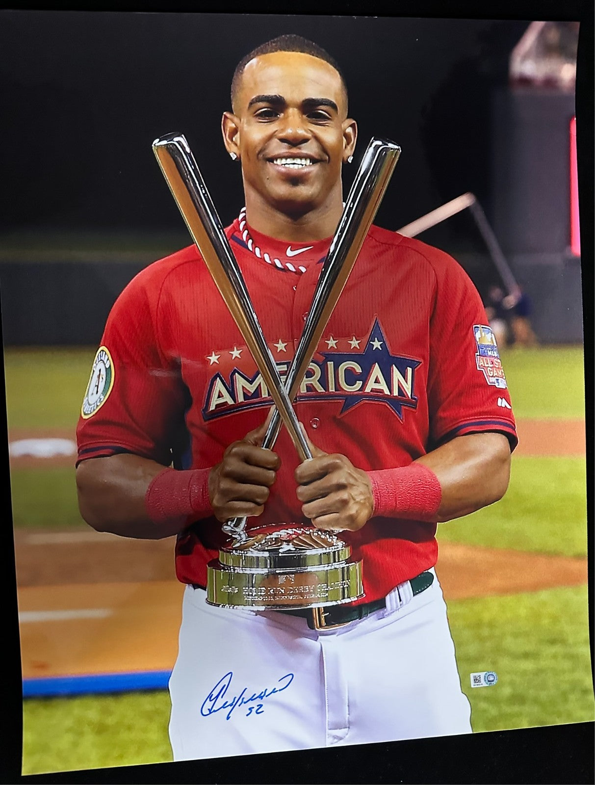 We're offering this 16x20 Photo Autographed by Oakland A's Slugger Yoenis Cespsdes Celebrating his 2014 Home Run Derby Championship. It comes with a COA & Matching Hologram Issued by MLB Authentic (EK950218) and his signature is guaranteed to be 100% authentic. We will combine on shipping for similar items.