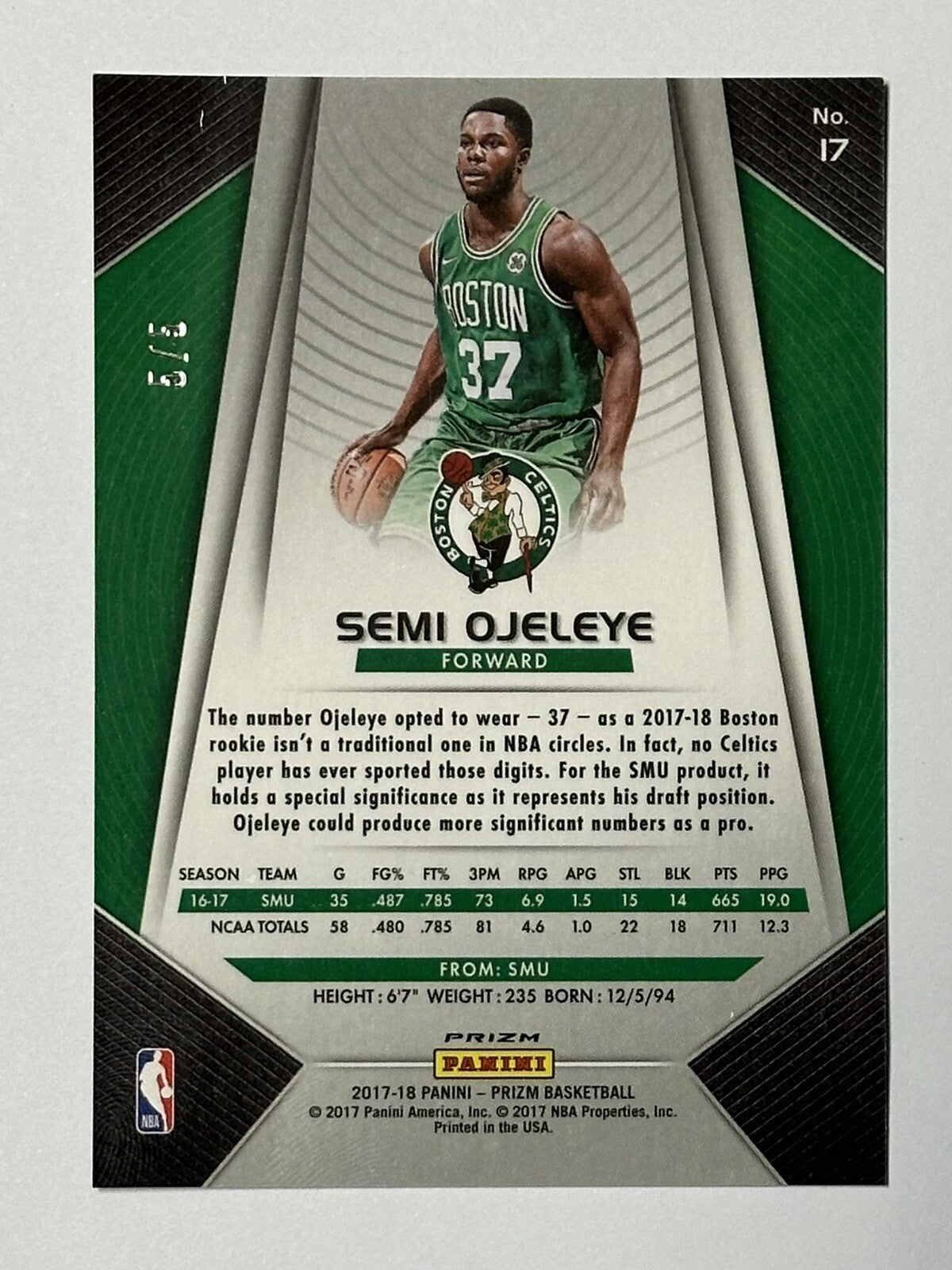 This 2017-18 Panini Prizm Semi Ojeleye Rookie Fast Break trading card is a must-have for any basketball fan. With a limited edition of only 5 cards, this trading card is a rare find and perfect for any collector. The card features a stunning image of Semi Ojeleye, a rookie player who has made a name for himself in the basketball world.