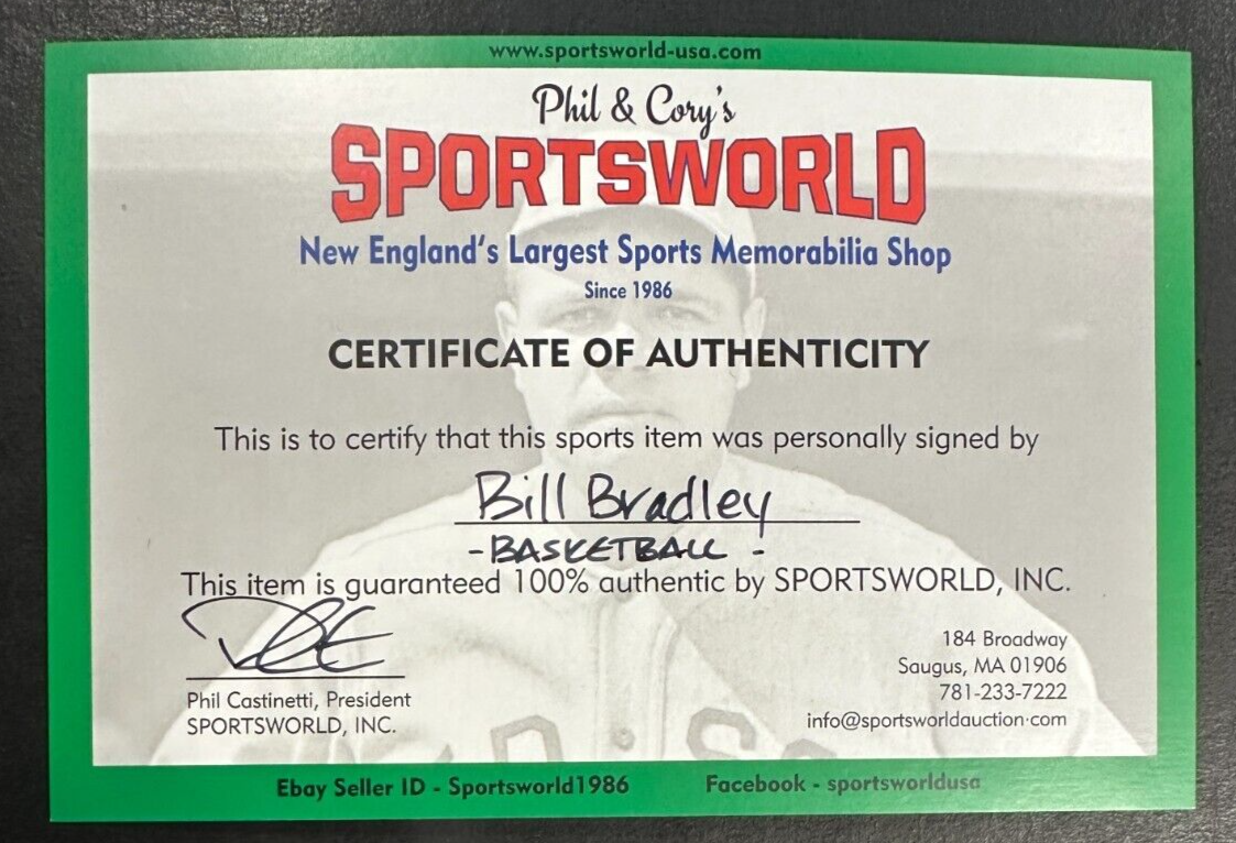 This Spalding Official NBA Basketball Autographed by Pro Basketball Hall of Fame Bill Bradley of the New York Knicks. It's in nm condition, it comes with a COA Issued by Sportsworld, New England's Largest Sports Memorabilia Store and his signature is guaranteed to be 100% authentic. We will combine on shipping for similar items!