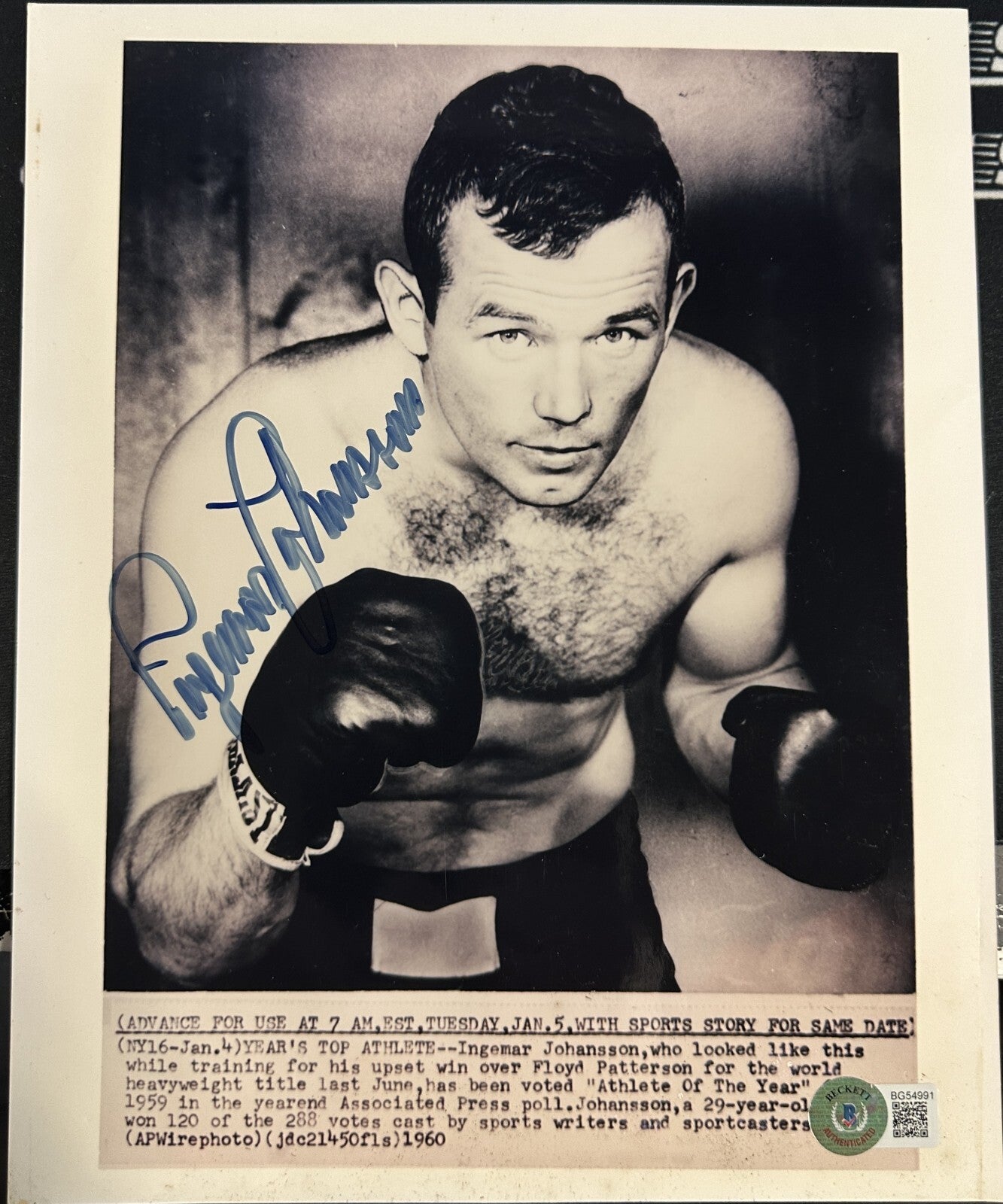 We're offering this 8x10 Photo of an original wire photo Autographed by former Heavyweight Boxing Champion Ingemar Johansson. It comes with a Hologram issued by BAS (BG54991) Beckett Authentication Services and his signature is guaranteed to be 100% authentic. The photo is in nm condition, and we will combine on shipping for similar items.