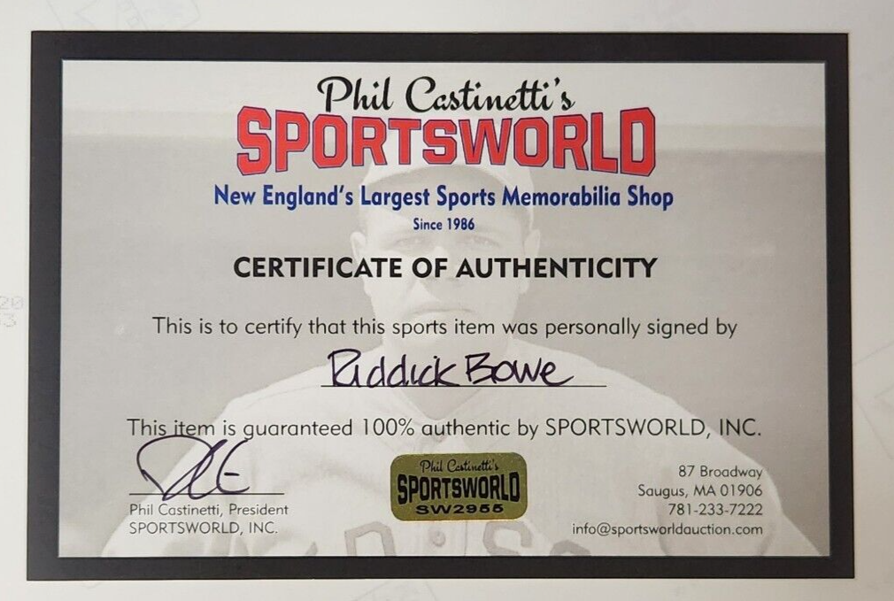 We're offering this 8x10 photo autographed by Pro Boxing Hall of Famer and former Heavyweight Champ Riddick Bowe. It comes with a COA issued by Sportsworld, New England's Largest Sports Memorabilia Store and his signature is guaranteed to be 100% authentic. We will combine shipping on similar items.
