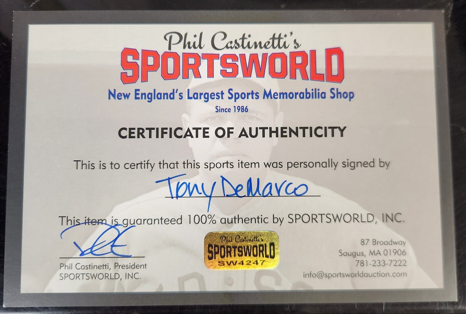 This 8x10 photo is a rare find for any boxing fan. It features the signature of Tony DeMarco and comes with a Certificate of Authenticity. The photo is an original and not a reprint, making it a valuable addition to any sports memorabilia collection.