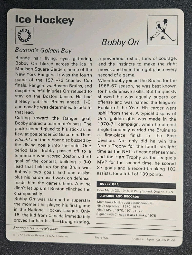 The product is a 1977 Sportscasters Series 01 trading card featuring Hall of Famer Bobby Orr of the Boston Bruins. This single-insert card was printed in Japan and includes the player's name and number (#01-02) within the set. Manufactured by Editions Rencontre S.A., this original sports trading card captures a moment in multi-sport history from 1977. A must-have for any collector of sports memorabilia, this unique card highlights the iconic career of Bobby Orr.