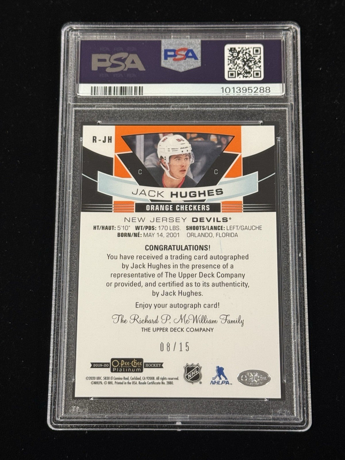 The product is a 2019 Jack Hughes OPC Platinum Rookie Auto Orange Checkers trading card, graded as a PSA 10 for its high quality. This card features an autograph from Jack Hughes, a promising rookie ice hockey player from the New Jersey Devils in the National Hockey League (NHL). As part of the OPC parallel variety by O-Pee-Chee, this limited edition card is numbered out of 15 and is a valuable collectible for fans and collectors of sports trading cards.