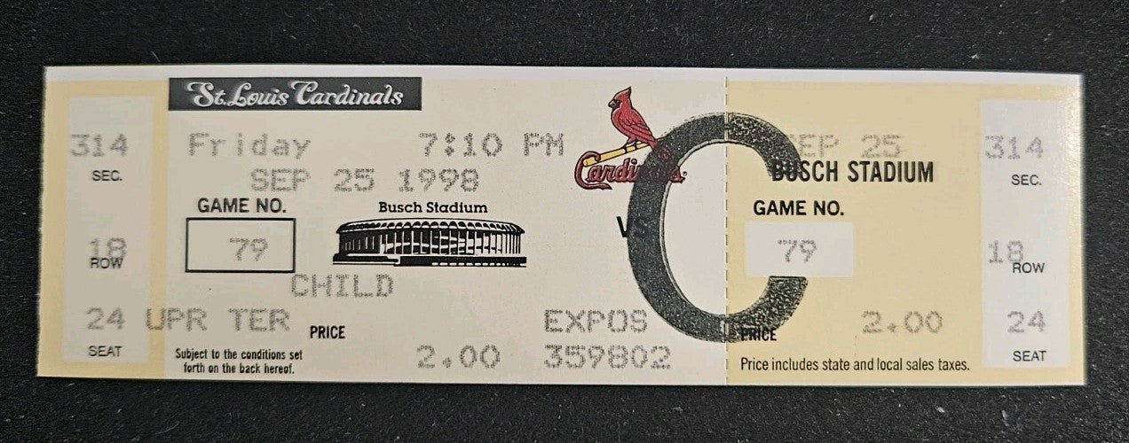 This full ticket from the 9/25/98 game between the St. Louis Cardinals and the Montreal Expos is a must-have for any baseball fan. It featured the iconic Mark McGwire and his 66th home run. The ticket is an original vintage piece and is in great shape, ready to be added to any sports memorabilia collection.