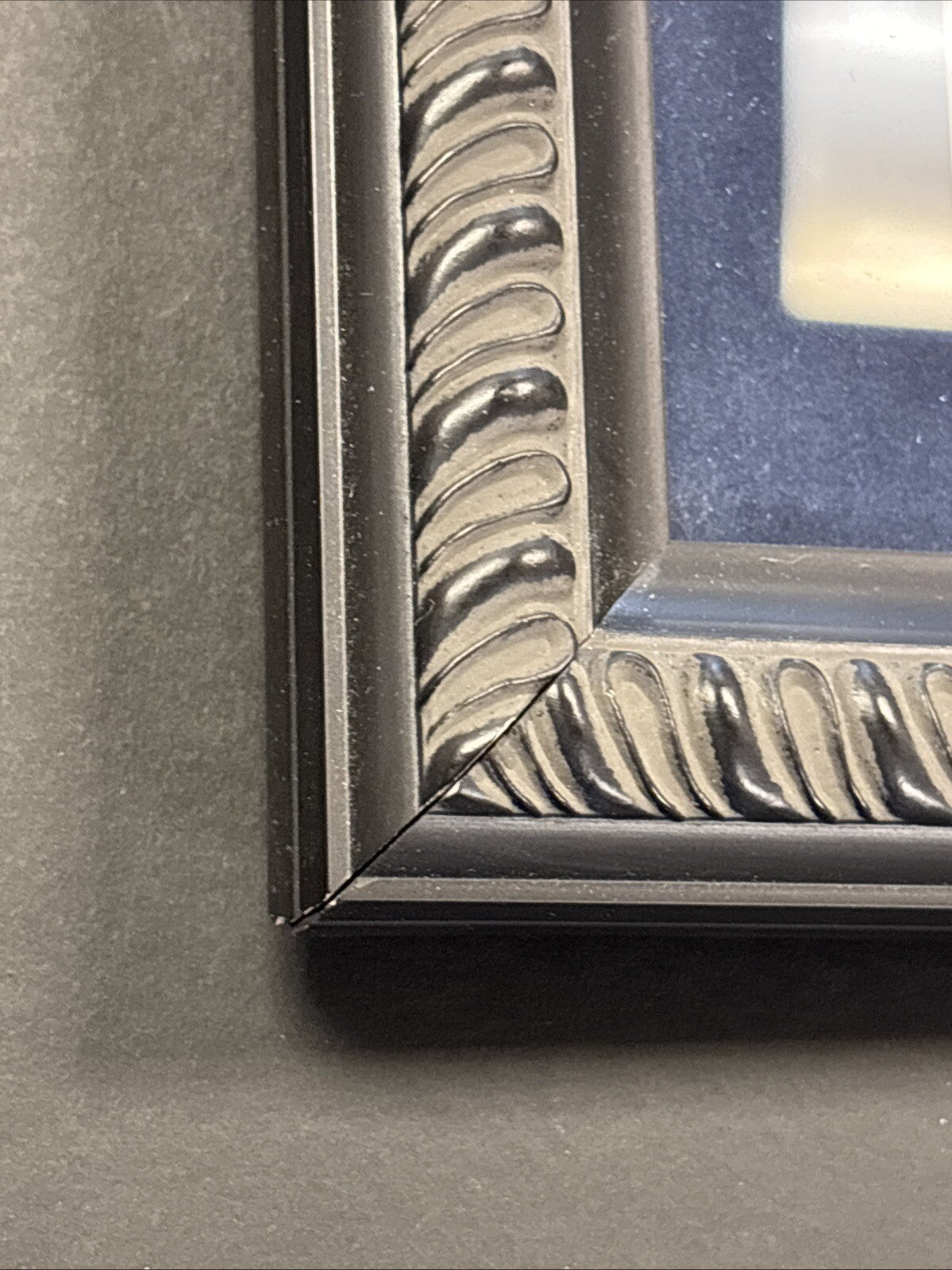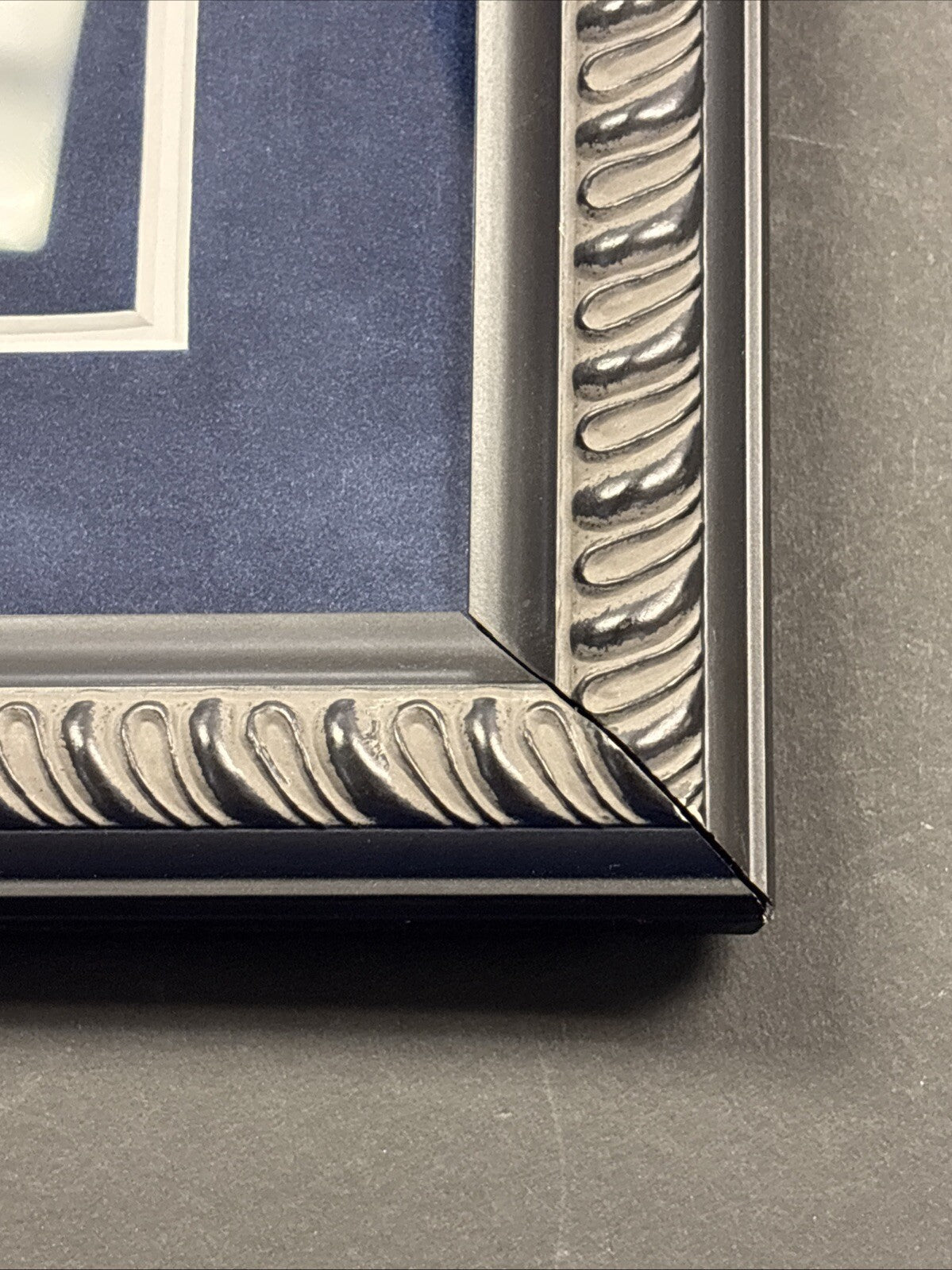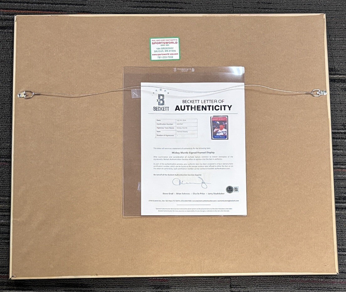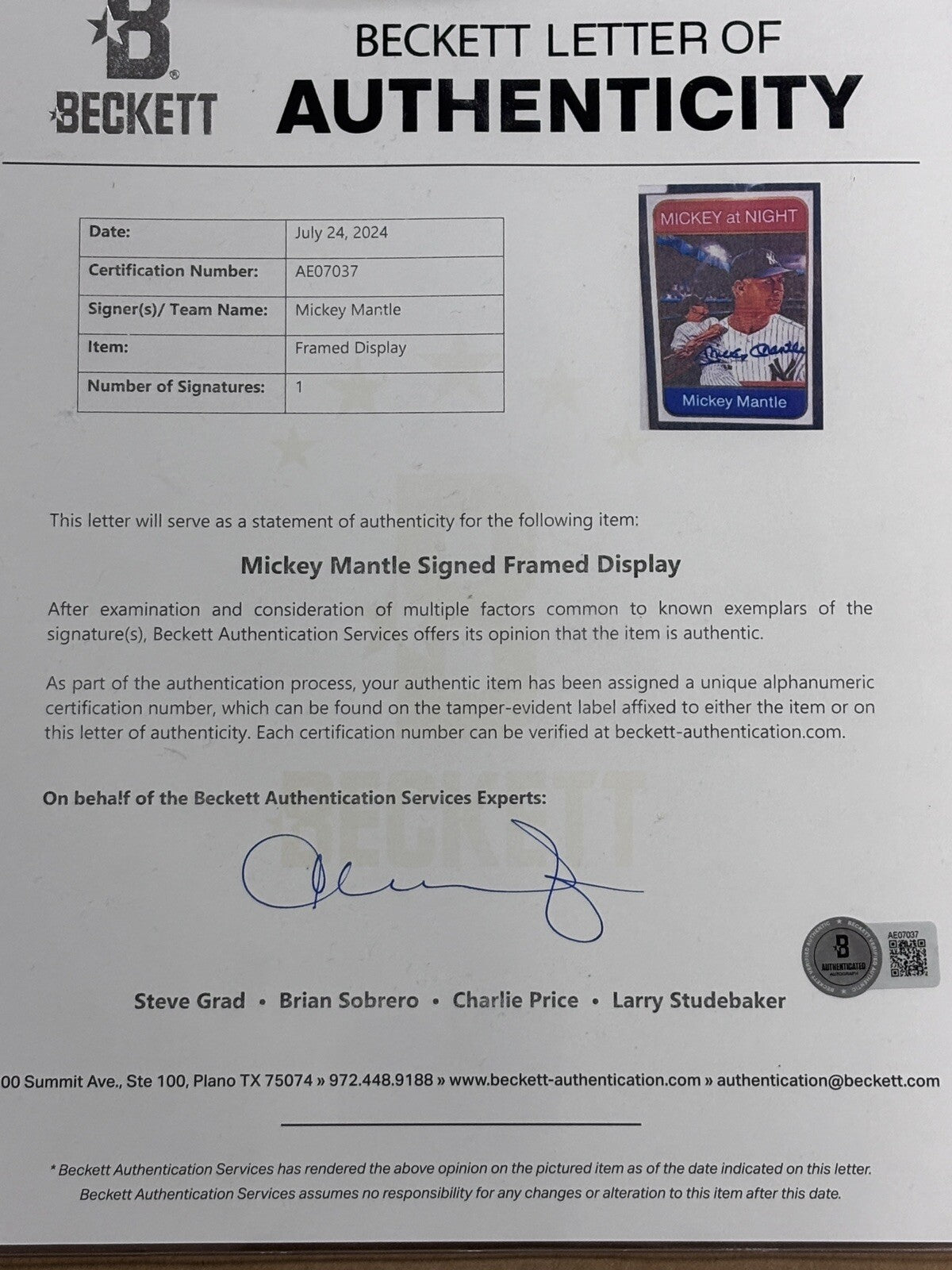 The product is a framed 5x7 card featuring a sports impression of Mickey Mantle, signed by Mantle himself. The autograph has been authenticated by Beckett Authentication Services (BAS) to ensure its authenticity. The photo displays Mantle in his New York Yankees uniform, making this a valuable and collectible piece for baseball fans and memorabilia collectors. Frame has a few scratches but overall in great condition and measures 22x26.