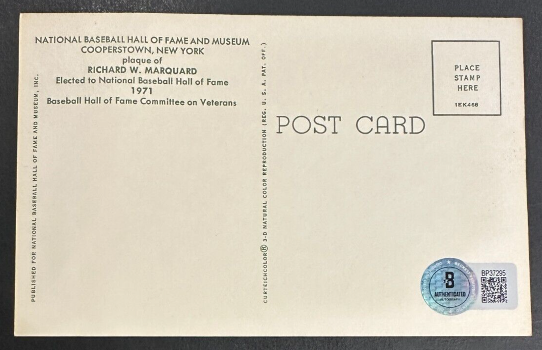 We're offering Official Baseball Hall of Fame Postcard autographed by former New York Giants All-Star Pitcher Rube Marquard. It's nm condition. It comes with a Hologram Issued by BAS (BP37295) Beckett Authentication Services and his signature is guaranteed to be 100% authentic. We will combine on shipping for similar items!