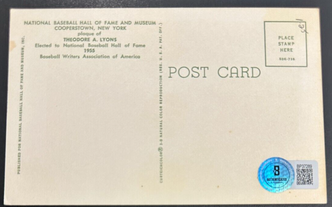 We're offering Official Baseball Hall of Fame Postcard autographed by former Chicago White Sox All-Star Pitcher Ted Lyons. It's nm condition. It comes with a Hologram Issued by BAS (BP37289) Beckett Authentication Services and his signature is guaranteed to be 100% authentic. We will combine on shipping for similar items!