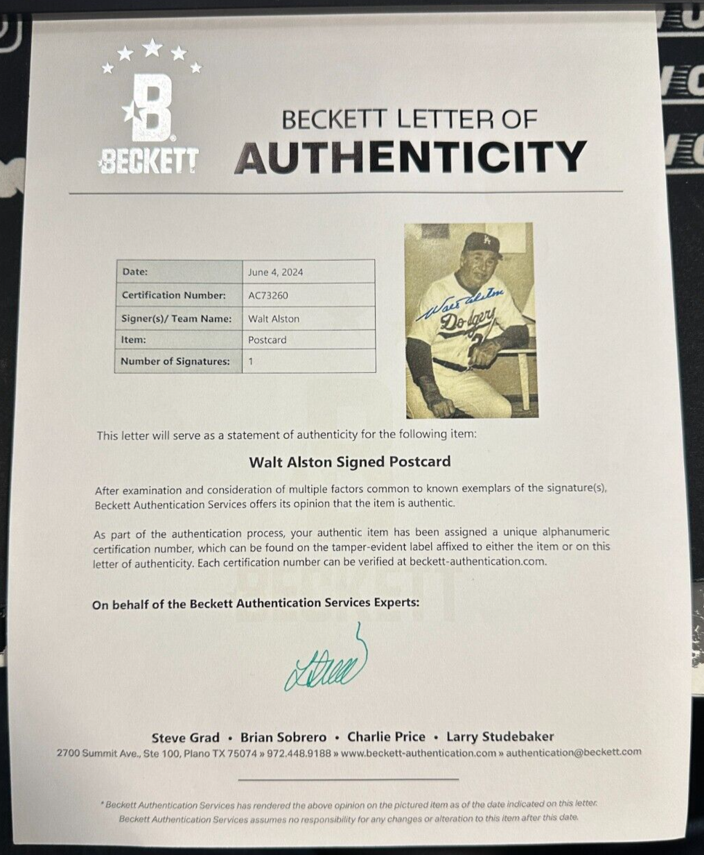 We're offering this postcard autographed by former Dodgers Manager Walter Alston. It'sin nm condition. It comes with a Full Letter LOA and Matching Hologram Issued by BAS (AC73260) Beckett Authentication Services and his signature is guaranteed to be 100% authentic. We will combine on shipping for similar items!