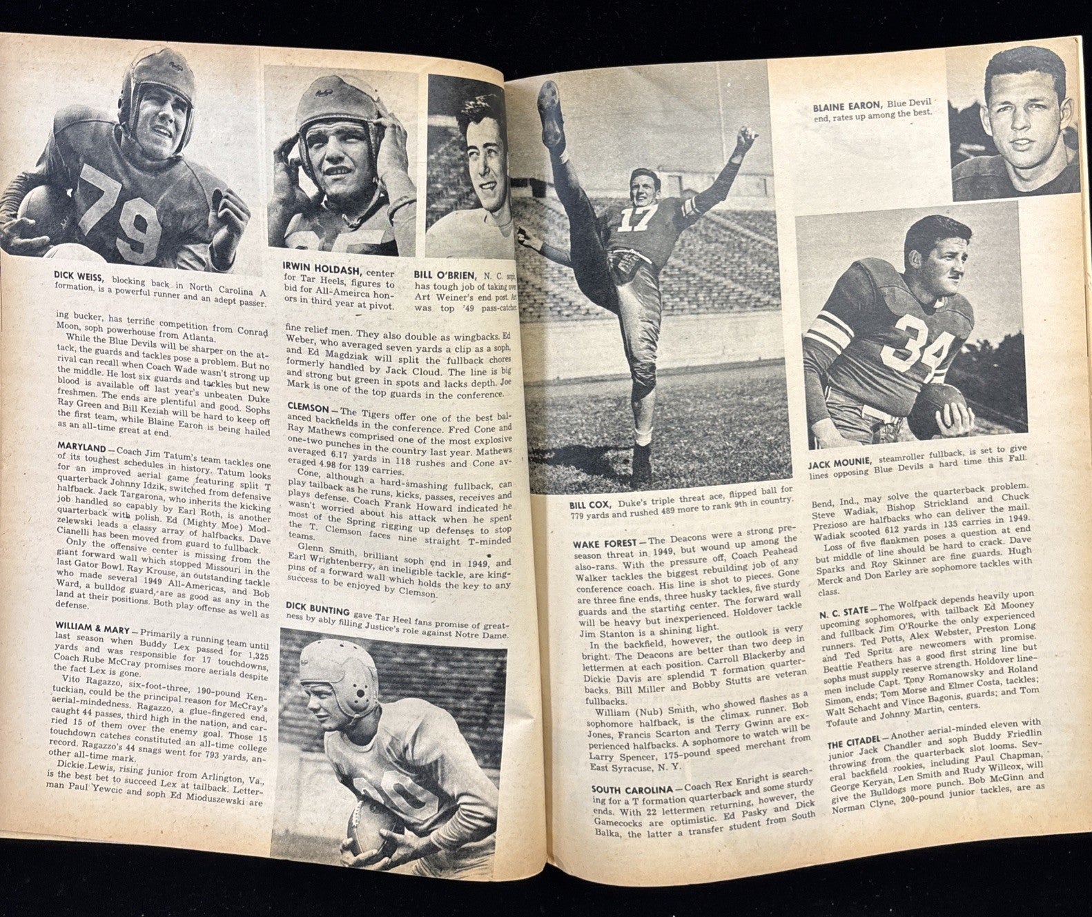 The product is a vintage 1950 Sports Football issue from Street & Smith, featuring college and professional football roundups. This original publication is a valuable piece of sports memorabilia, providing a unique glimpse into the football scene of the 1950s. With its focus on the sport of football and its vintage nature, this magazine is a prized collector's item for fans of both college and professional football.