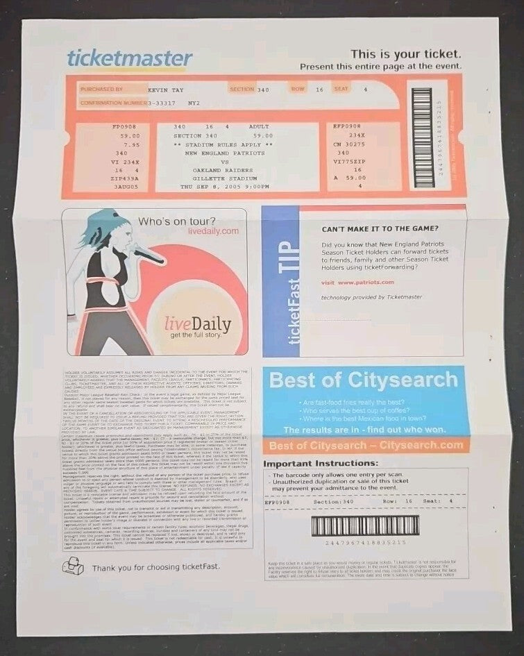 9/8/05 Patriots vs. Raiders Program & Ticket Superbowl Banner Ceremony