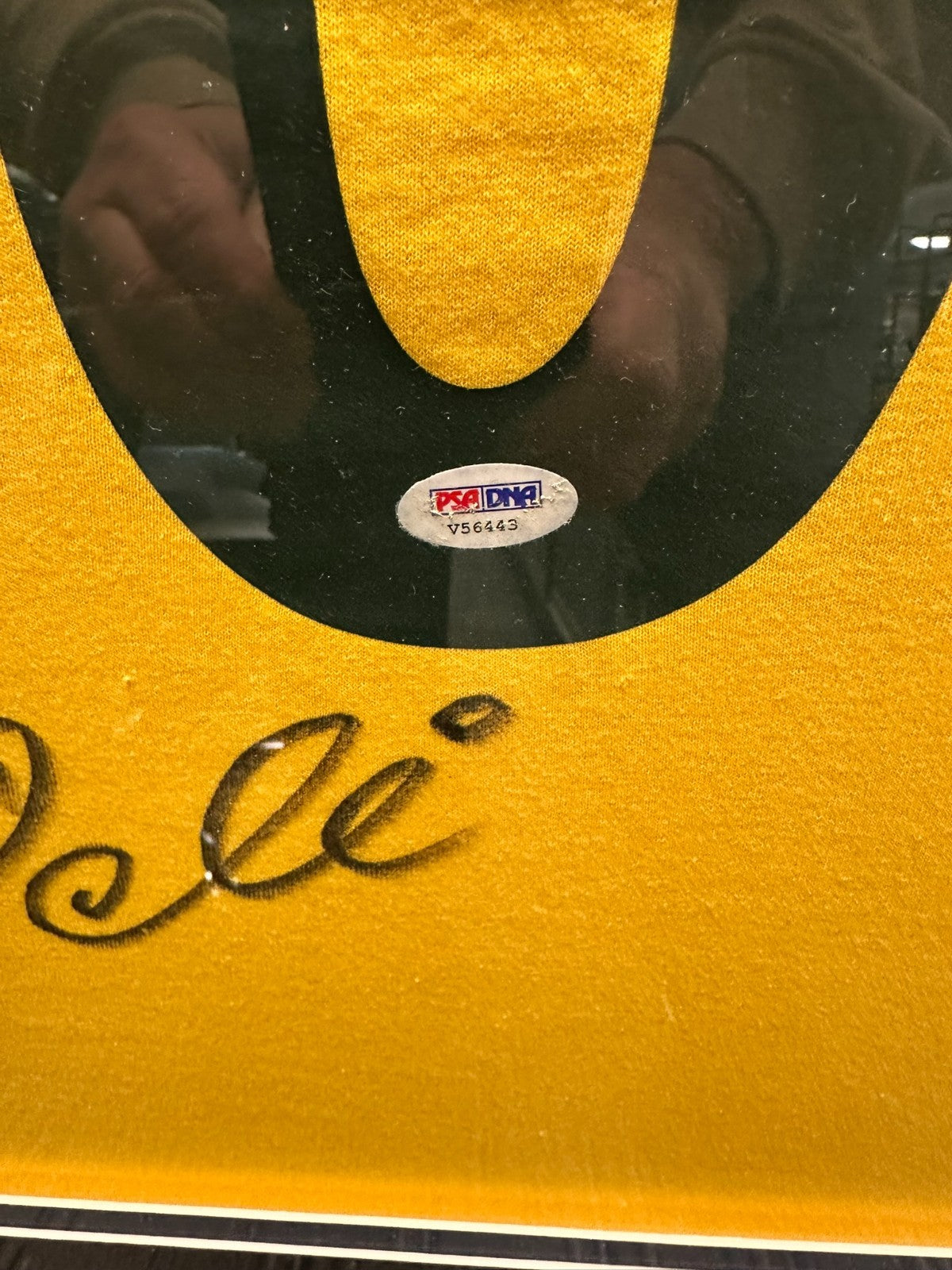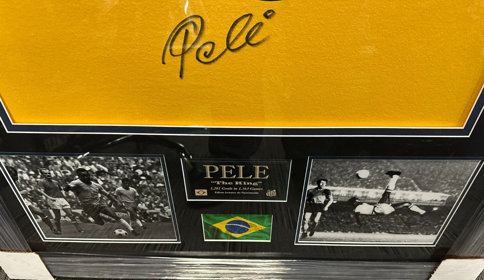 The product is a Pele autographed Brazil soccer jersey framed & authenticated by Professional Sports Authenticator (PSA). This authentic signed jersey holds significant value for soccer fans and collectors alike. The iconic player's signature adds a touch of history and prestige to this memorabilia piece, making it a coveted item for fans of Pelé and Brazil national team. Displaying this jersey in a frame adds a special touch to any sports memorabilia collection. The entire frame measures approximately 36" x 44".