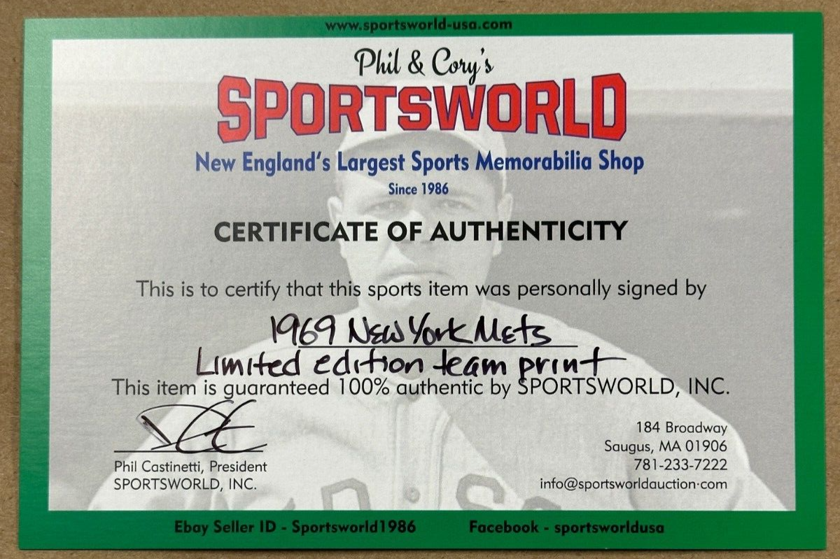 We're offering this framed 16x20 Photo From the 1969 Mets 20th Anniversary autographed by 18 members of the team. Signatures on the print include Al Weis, Jerry Koosman, Gery Gentry, Don Cardwell, Jack DiLauro, Jim McAndrew, Don Clendenon, J.C. Martin, Cal Koonce, Ron Taylor, Jerry Grote, Cleon Jones, Tommie Agee, Ron Swoboda, Ken Boswell, Ed Kranepool, Ed Charles & Art Shamsky. It's matted & framed, and it comes with a COA issued by Sportsworld, New England's Largest Sports Memorabilia Store and his signature is guaranteed to be 100% authentic. The photo is in nm condition and the entire frame measures approx 22" x 28". We will combine on shipping for similar items.