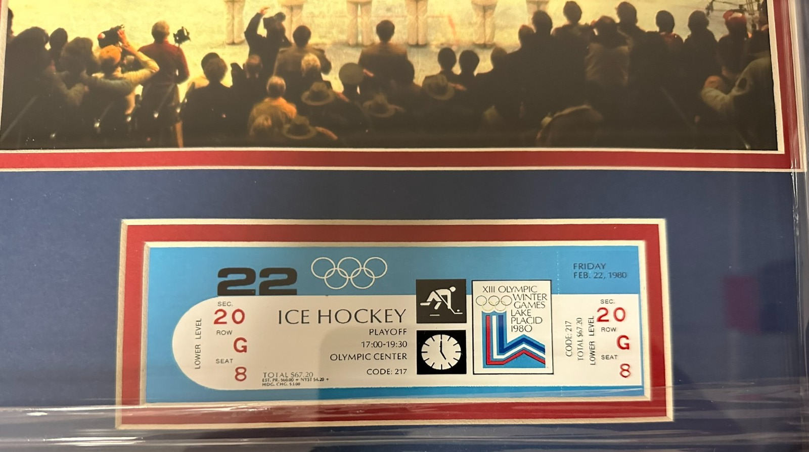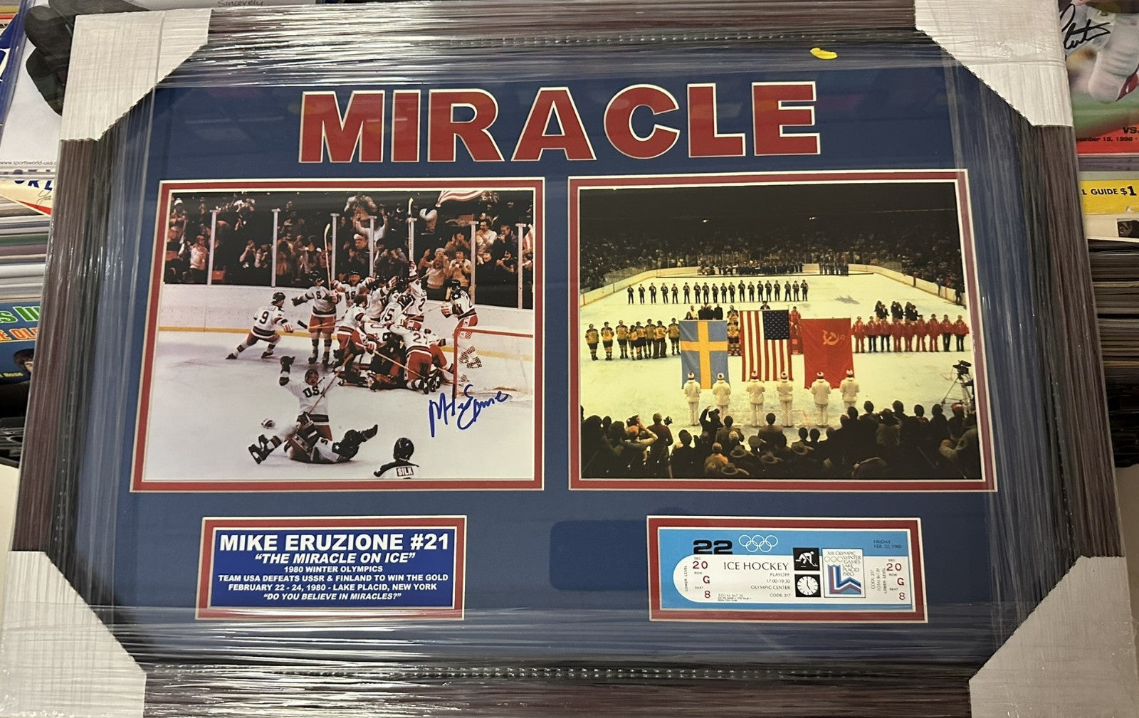 We're offering this 8x10 photo autographed by former Team USA Captain Mike Eruzione. It's beautifully matted & framed along with a plaque, a photo of the Gold Medal Ceremony as well as a replica ticket. It comes with a COA issued by Sportsworld New England's Largest Sports Memorabilia Store and his signature is guaranteed to be 100% authentic. The entire piece measures approximately 26" x 18".