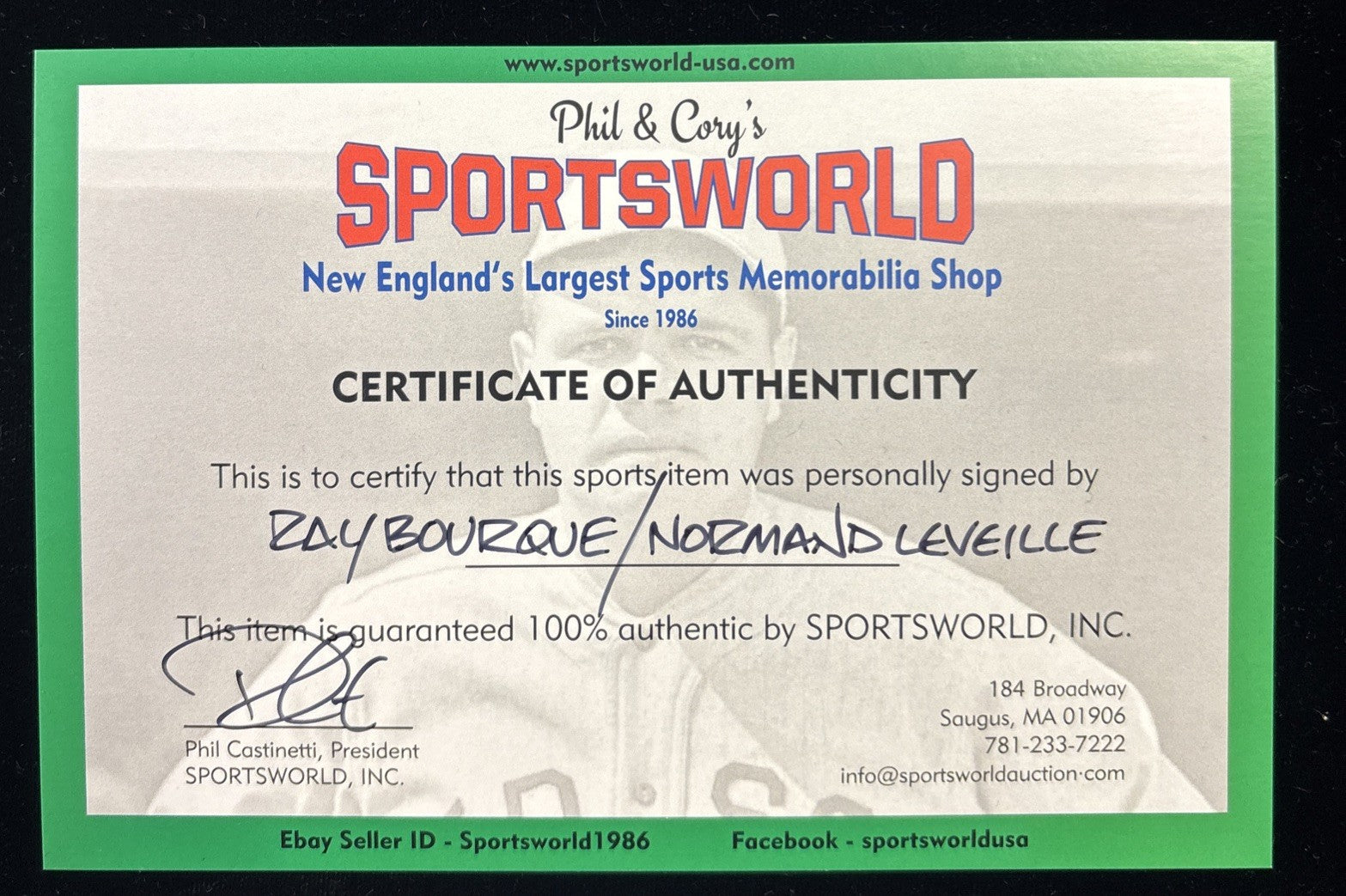 This product is an 8x10 framed photo signed by both Ray Bourque and Normand Leveille of the Boston Bruins. The autograph is authenticated by Sportsworld, a well-known memorabilia shop in New England. The photo captures a moment in hockey history, making it a valuable and collectible item for fans of the sport and the Boston Bruins team. The authenticity of the signatures adds to the overall appeal and rarity of the piece, making it a desirable item for sports memorabilia enthusiasts.