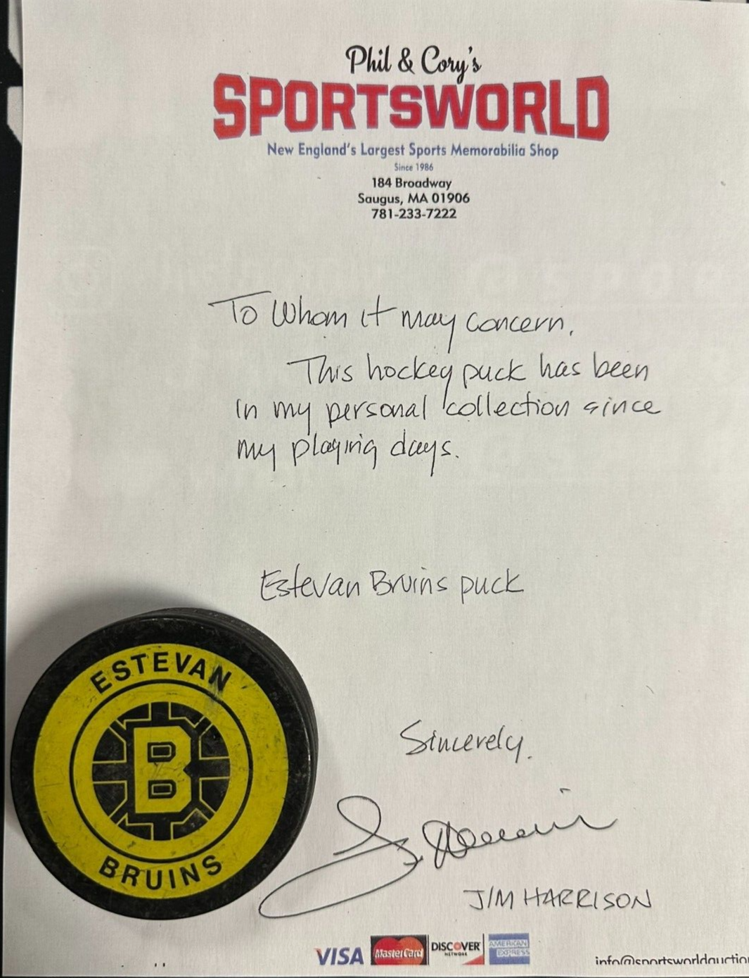 We're offering this vintage 1960's Estevan Bruins Game Used Hockey Puck. From the Personal collection of former NHL forward Jim Harrison who obtained this puck during his playing & coaching days. This is truly a one-of-a-kind item. We will be selling many other pucks from his personal collection as well. It comes with a LOA issued by Jim and Sportsworld, The Largest Sports Memorabilia Store in New England. We will combine on shipping for similar items!