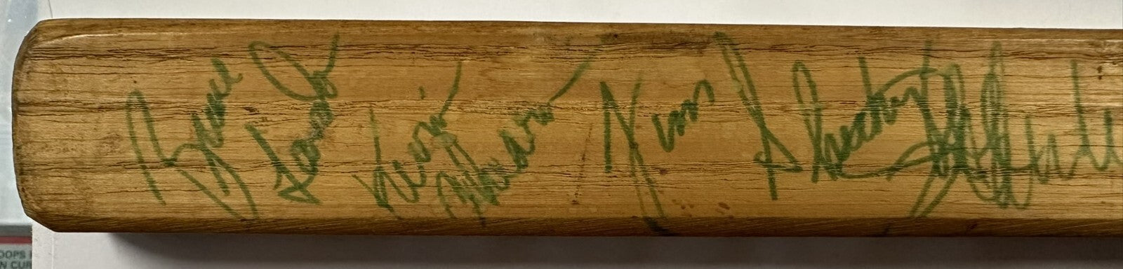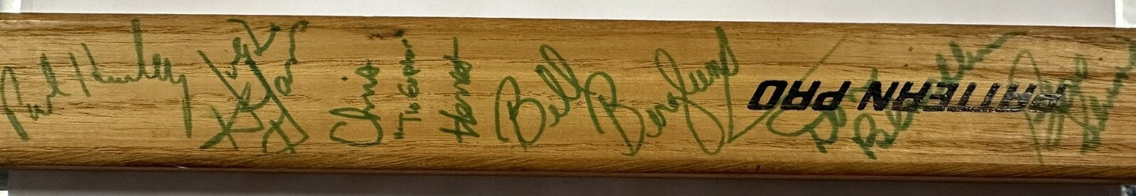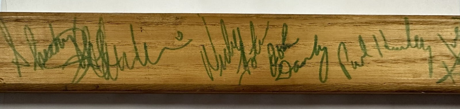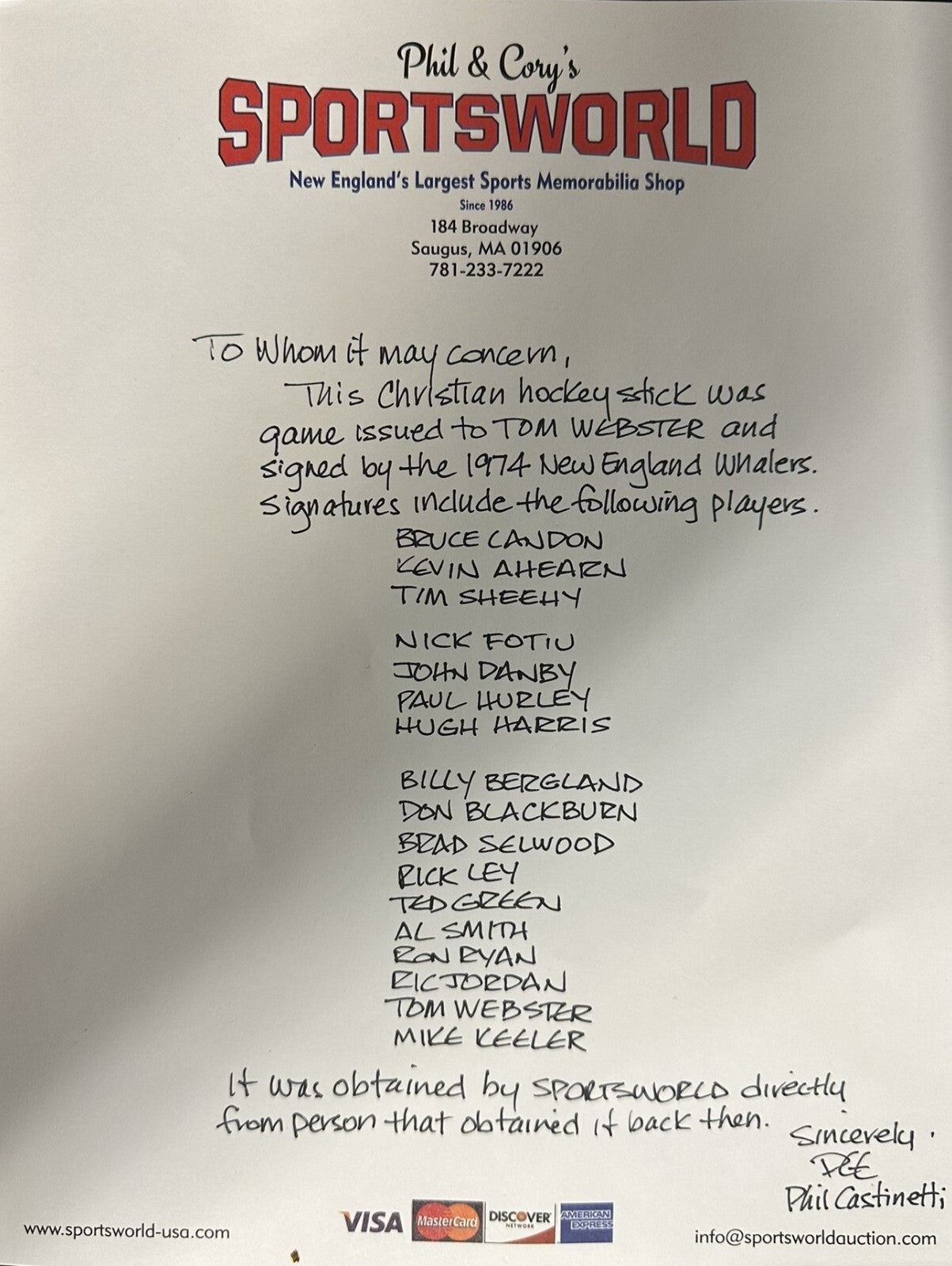 This Christian Hockey Stick was issued to Tom Webster of the New England Whalers for the 1974 WHA Season. The stick has been autographed by 17 Members of the team. Including Bruce Candon, Kevin Ahearn, Tim Sheehy, Nick Fotiu, John Danby, Paul Hurley, Hugh Harris, Billy Berglund, Don Blackburn, Brad Selwood, Rick Ley, Ted Green, Al Smith, Ron Ryan, Ric Jordan, Mike Keeler & Tom Webster. The Stick is in excellent condition and comes with a COA issued Sportsworld and all signatures a guaranteed to be 100% authentic.
