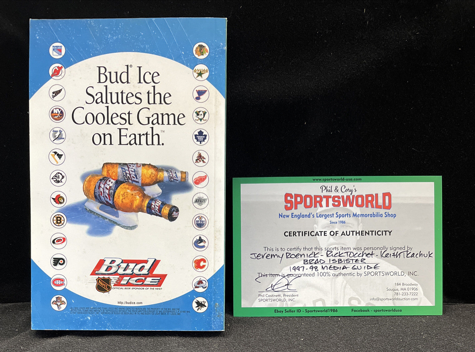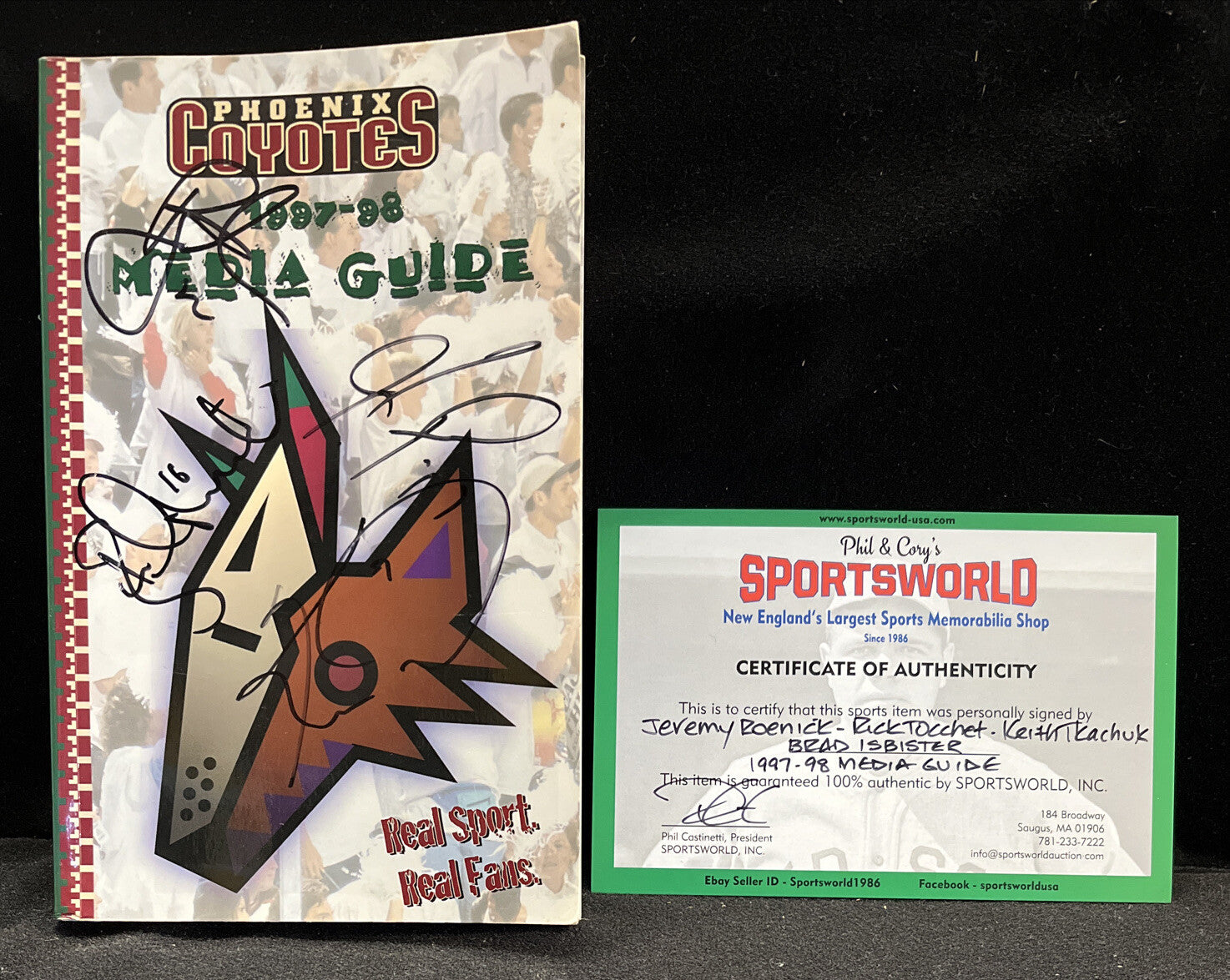 This 1997-98 Phoenix Coyotes media guide is a must-have for any avid hockey fan. It features information about the team and players, including the legendary Jeremy Roenick. This particular media guide has been signed by Roenick himself, making it a highly collectible item. The autograph has been authenticated by Sportsworld, ensuring its authenticity. Additionally, the guide includes signatures from other notable players such as Kieth Tkachuk, Rick Tocchet, and Brad Isbister. This is an original and unique piece of NHL memorabilia that any collector would be proud to own.