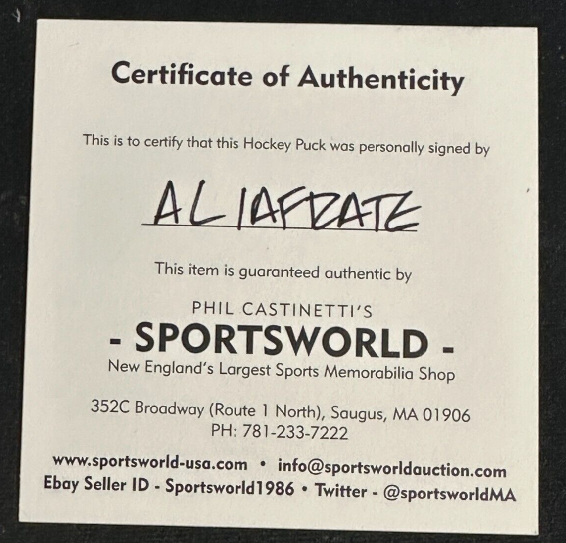 We're offering this Toronto Maple Leafs Hockey Puck Autographed by former All-Star Al Iafrate. It's in nm condition and comes with a COA issued by Sportsworld, New England's Largest Sports Memorabilia Store and his signature is guaranteed to be 100% authentic. We do have multiple pucks signed by Al so the puck that you receive might not be the same puck in the photo. The puck will be shipped in a plastic display square, and we will combine shipping on similar items.