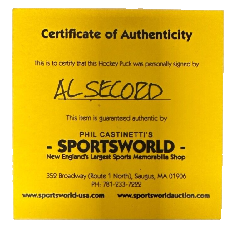 We're offering this Toronto Maple Leafs Hockey Puck Autographed by former Star Al Secord. It's in nm condition and it comes with a COA & Matching Hologram Issued by BAS Beckett Authentication Services and his signature is guaranteed to be 100% authentic. We do have multiple pucks signed by Al so the puck that you receive might not be the exact puck in the photo. It will be shipped in a plastic display square, and we will combine on shipping for similar items!