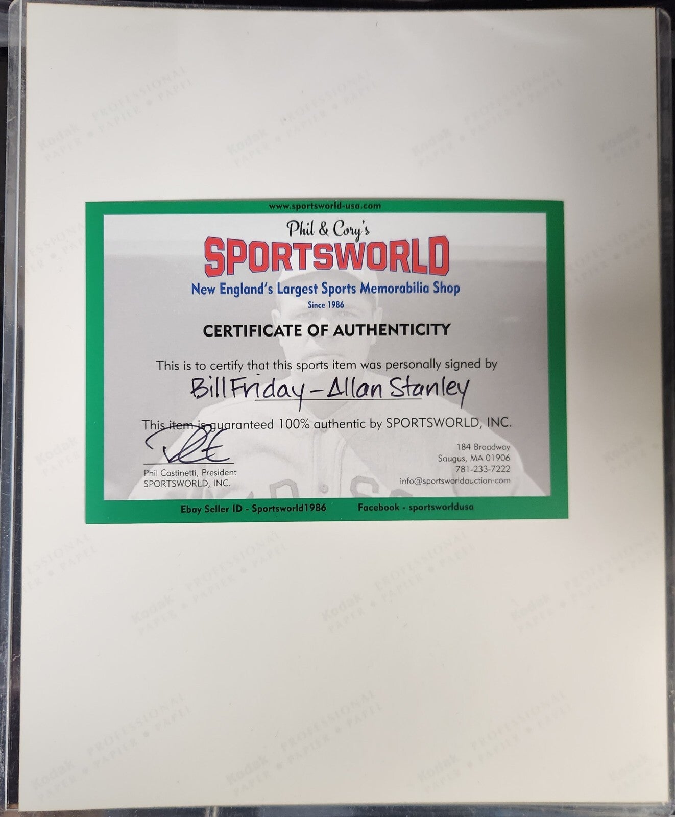 The product is an original 8x10 photo featuring hockey player Allan Stanley of the Toronto Maple leafs and Referee Bill Friday, both signed by them. The photo includes them in action during a game. A Certificate of Authenticity is included, ensuring the legitimacy of the signatures. This collectible item would be a valuable addition to any fan's memorabilia collection, especially for fans of the Toronto Maple Leafs or hockey in general.
